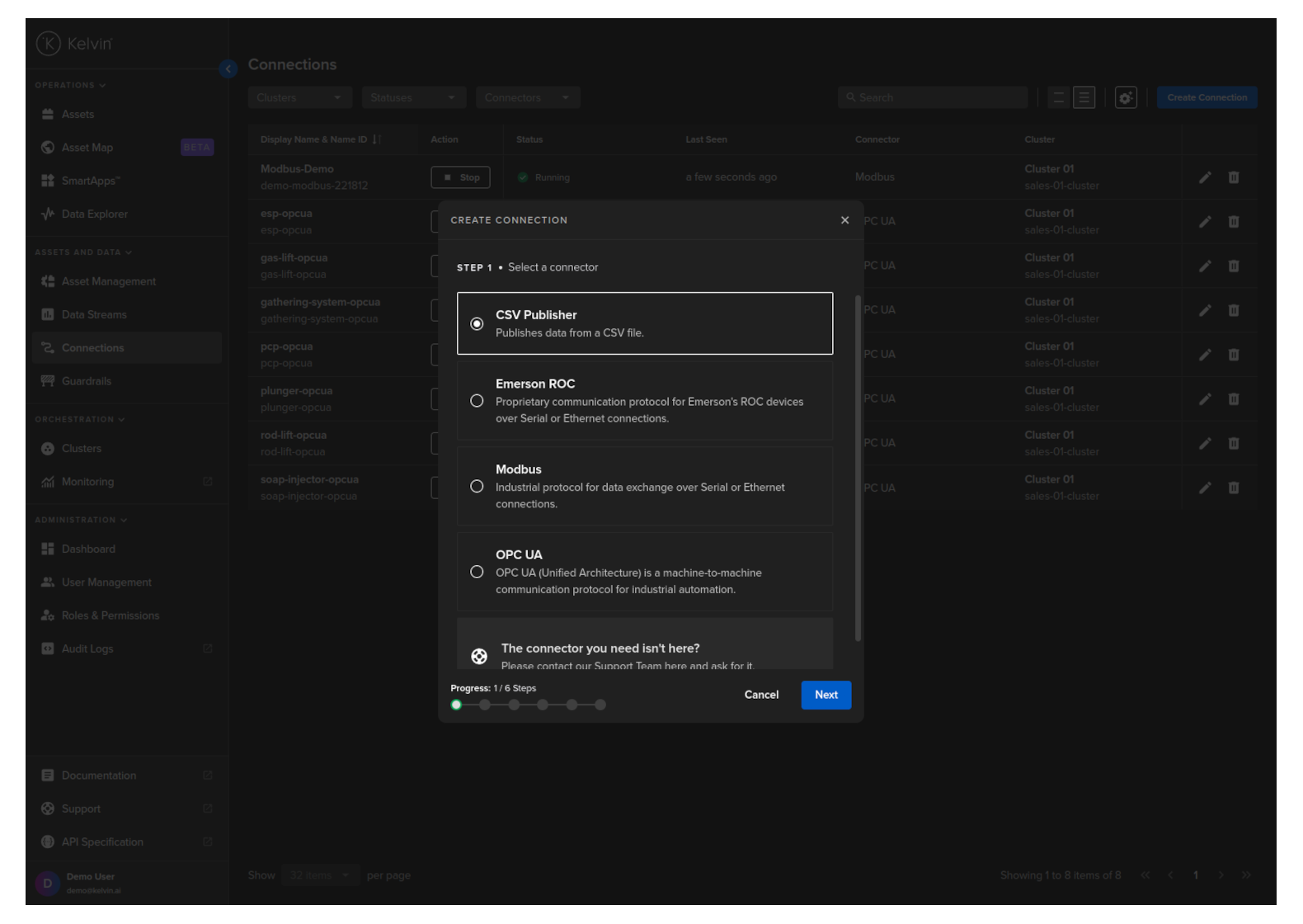 Scroll down and select the Kelvin CSV Publisher Connector option and click Next.