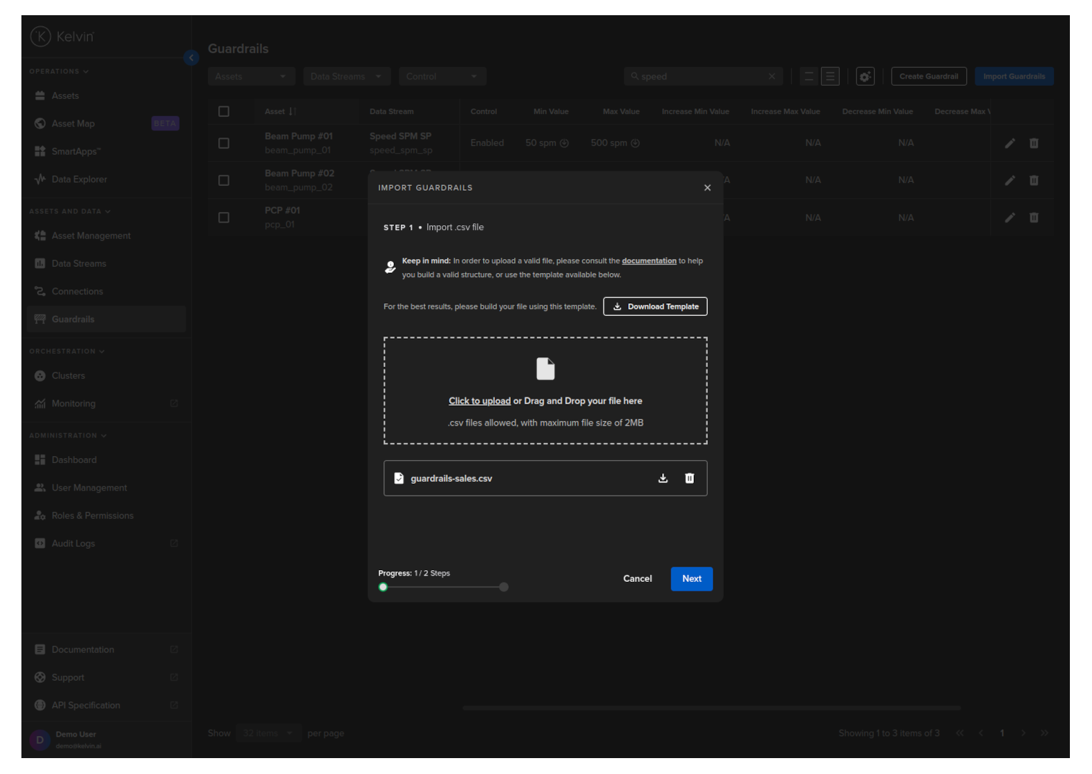 In Step 1 drag and drop your csv file of Guardrails and then click Next to go to Step 2.