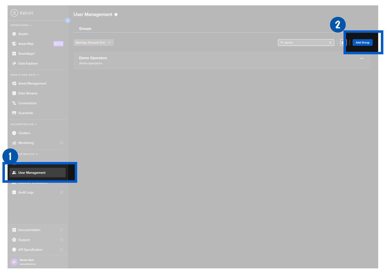 To start, click on User Management in the Administration section of the left side bar and click on the Add Group button.