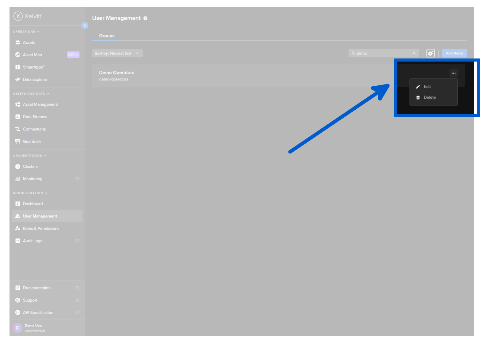 To edit the Group, click on User Management in the Administration section of the left side bar and then click on the options ... at the end of the row that you wish to edit, then click Edit.