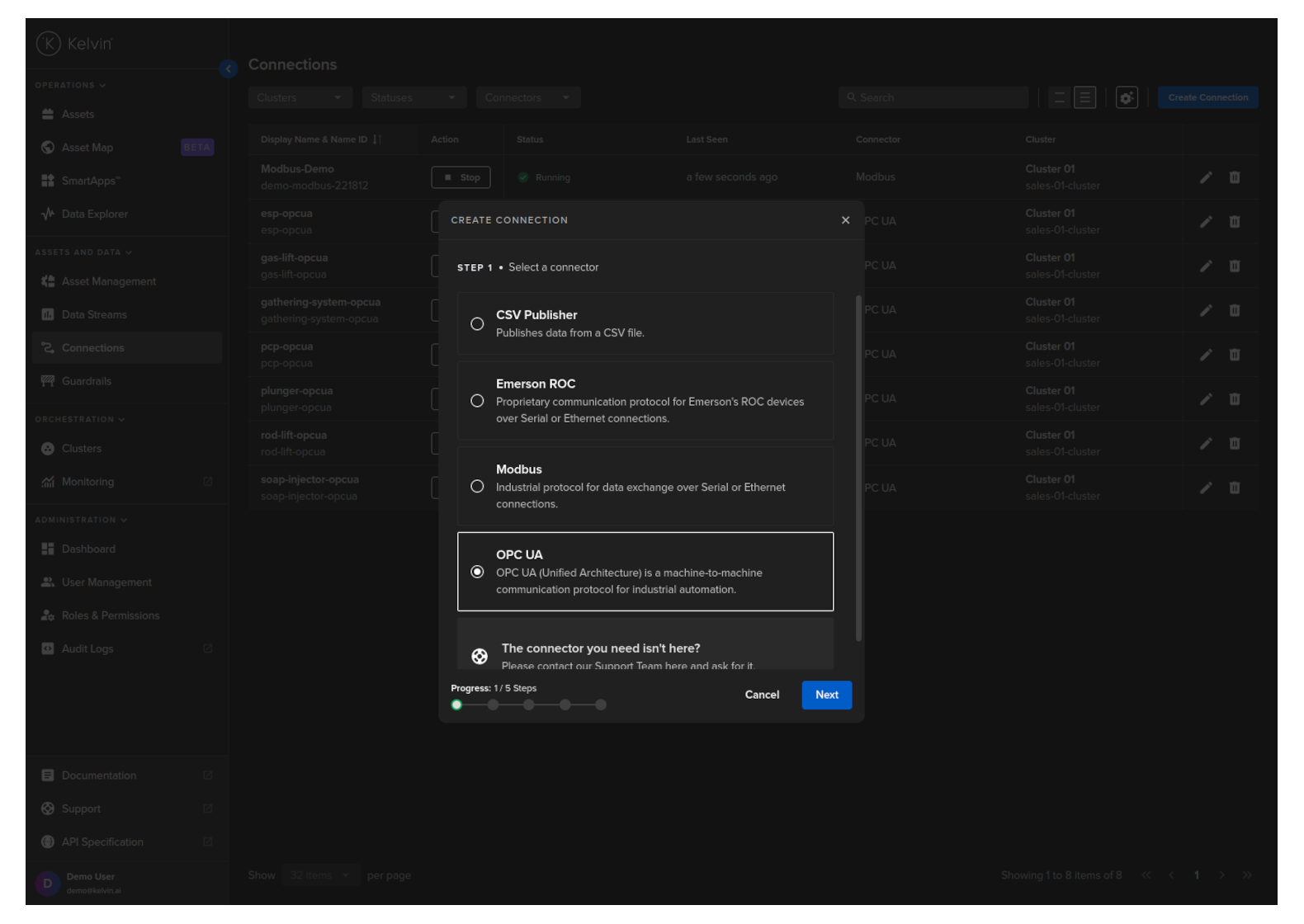 The primary role of a Connection is to channel real-time data streams from assets. With the capability to interface with a diverse set of industrial protocols and messaging protocols, the Connection ensures data contextualization, data normalization and data quality.