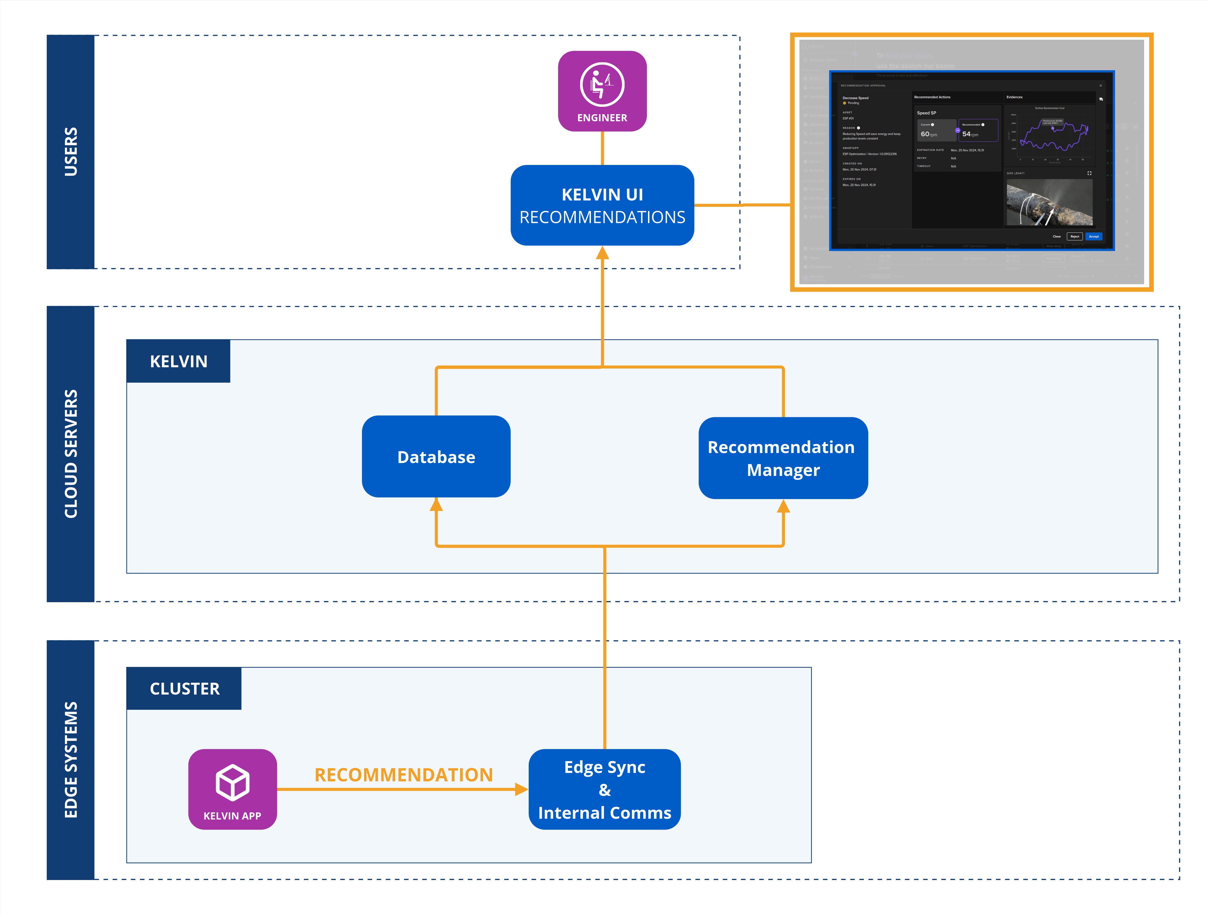Recommendations in Kelvin are a method to package one or more actions into a single Recommendation, which is then displayed in the Kelvin UI for Operations to review and approve.