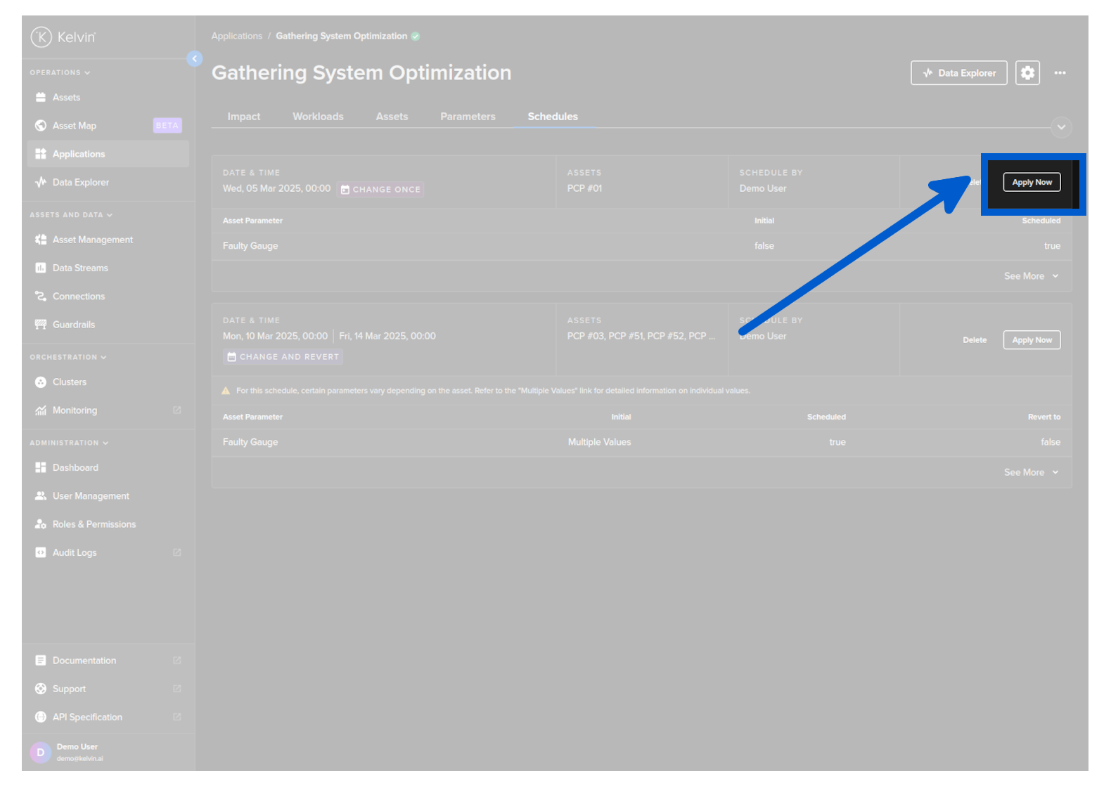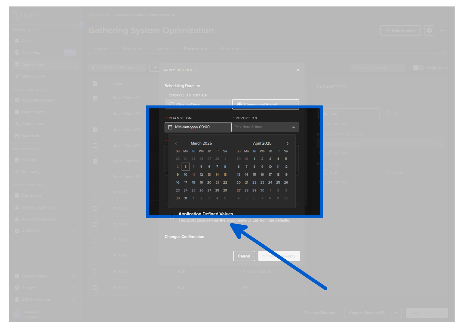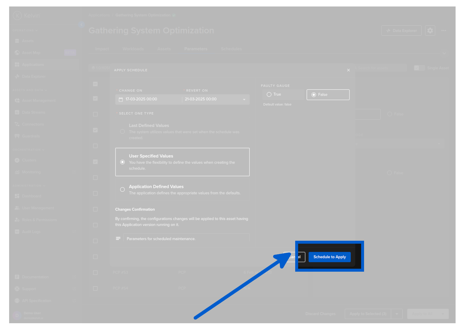 To start you can create a new schedule that will apply updated Kelvin SmartApps™ parameter values to selected asset at a defined time.
