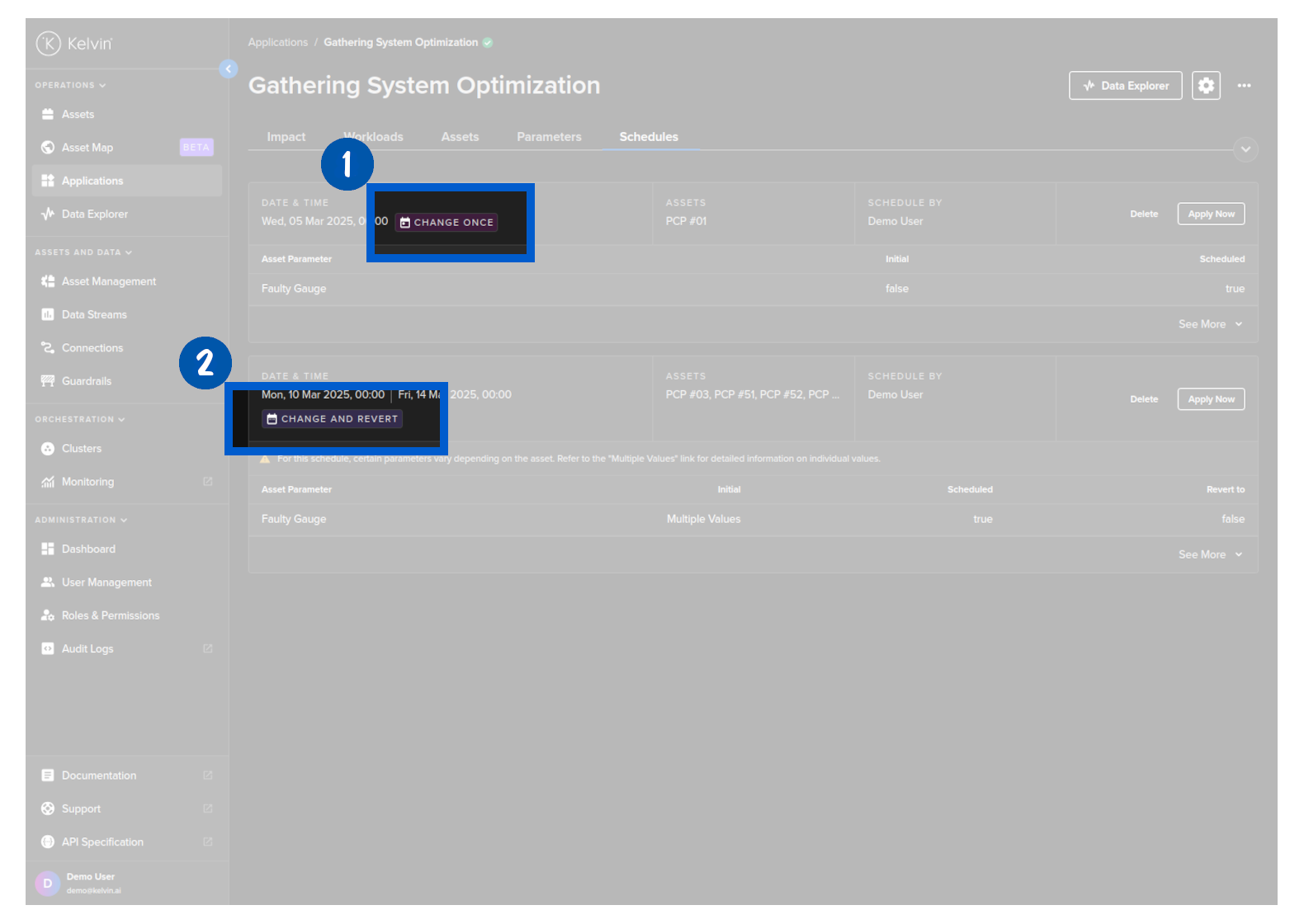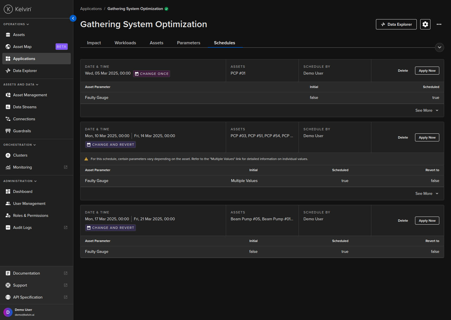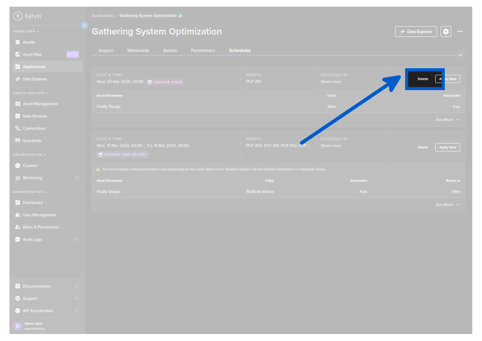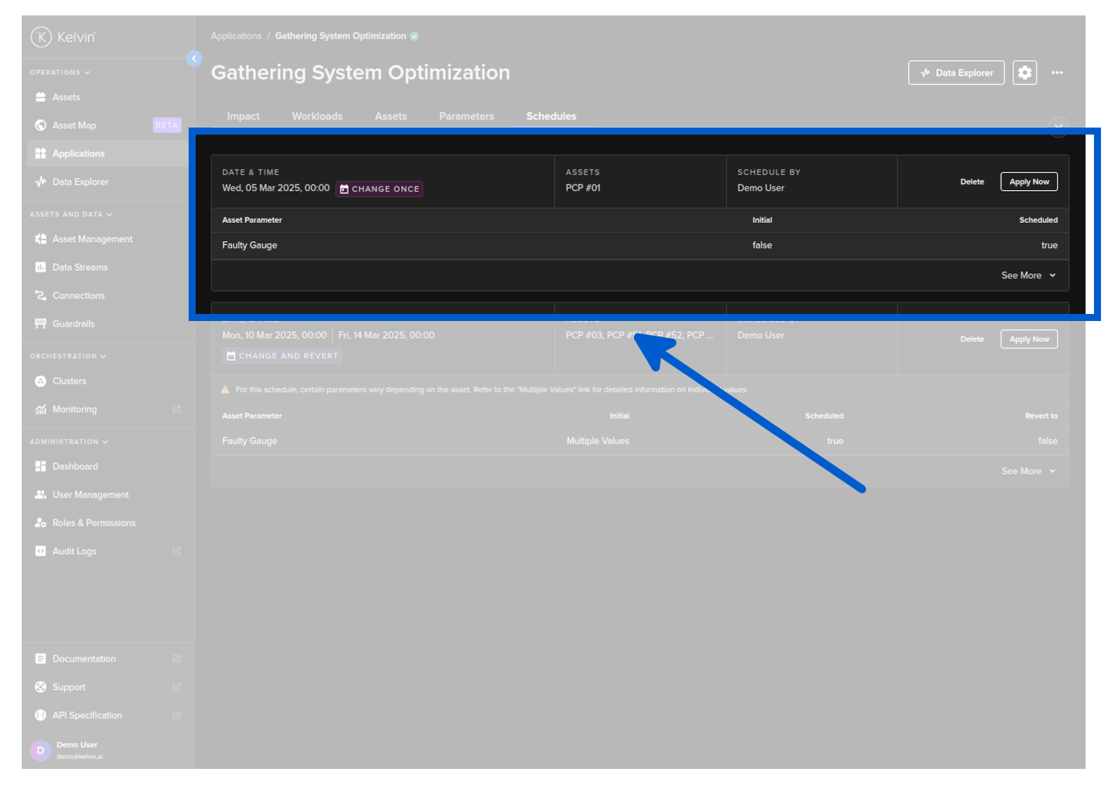 To start you can create a new schedule that will apply updated Kelvin SmartApps™ parameter values to selected asset at a defined time.