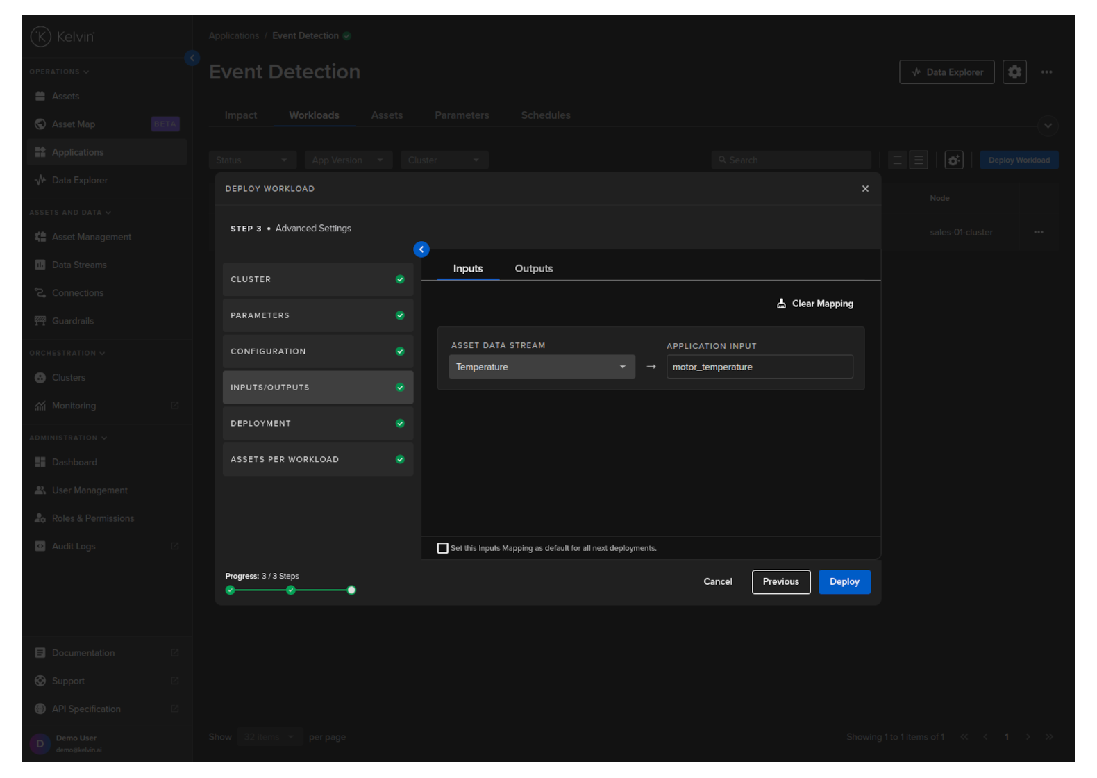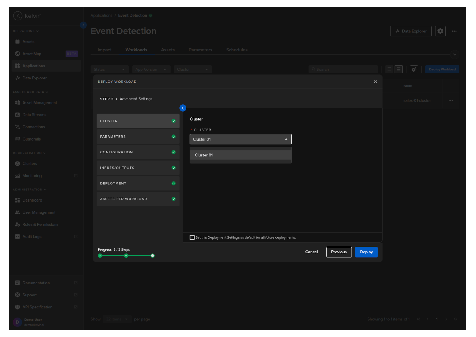 Before proceeding to add Assets to SmartApp in the Kelvin UI (which deploys a Workload to a Cluster in the background), make sure you have an active Cluster on your Instance and the default Cluster setting for Kelvin SmartApps™ deployment is set.