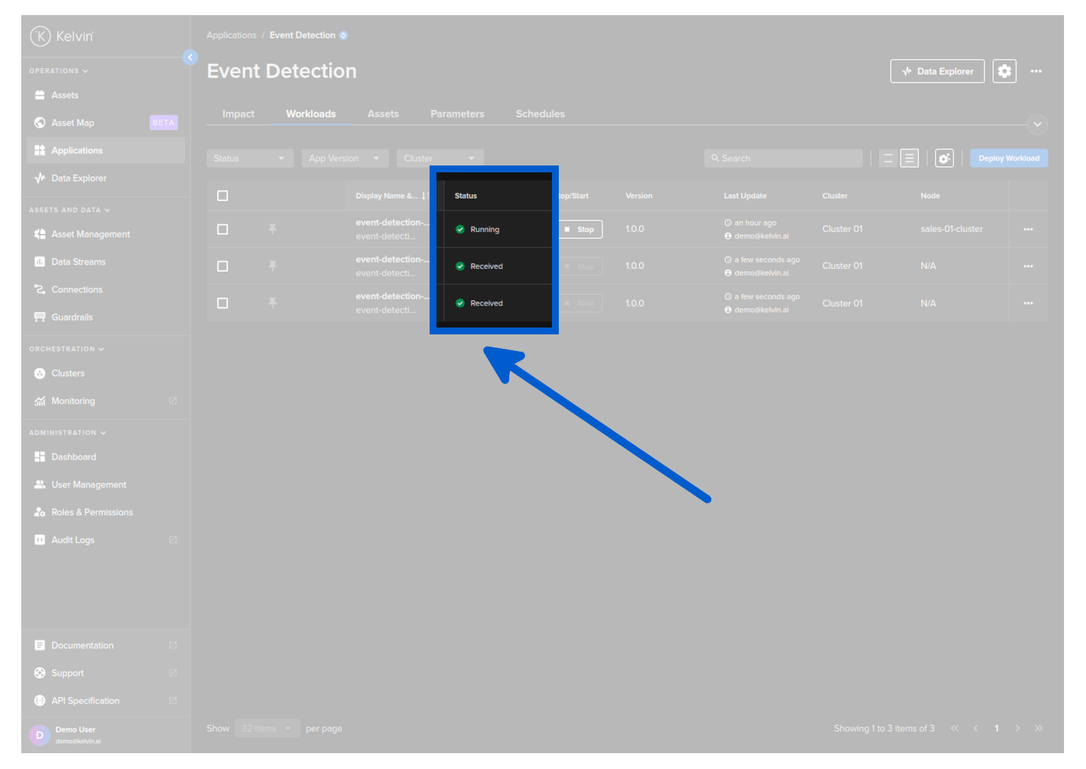 You can observe the workload being deployed to the assets. And in a couple of seconds the app will be running for the assets.