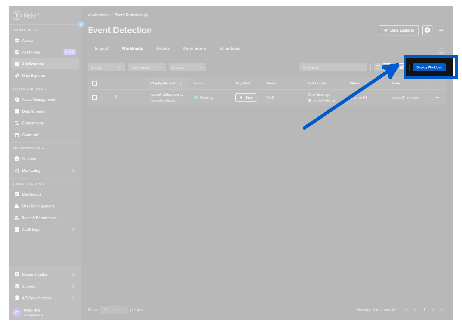 The next step is to deploy the app to assets. Click on the Workloads tab an then on the Deploy Workload button.