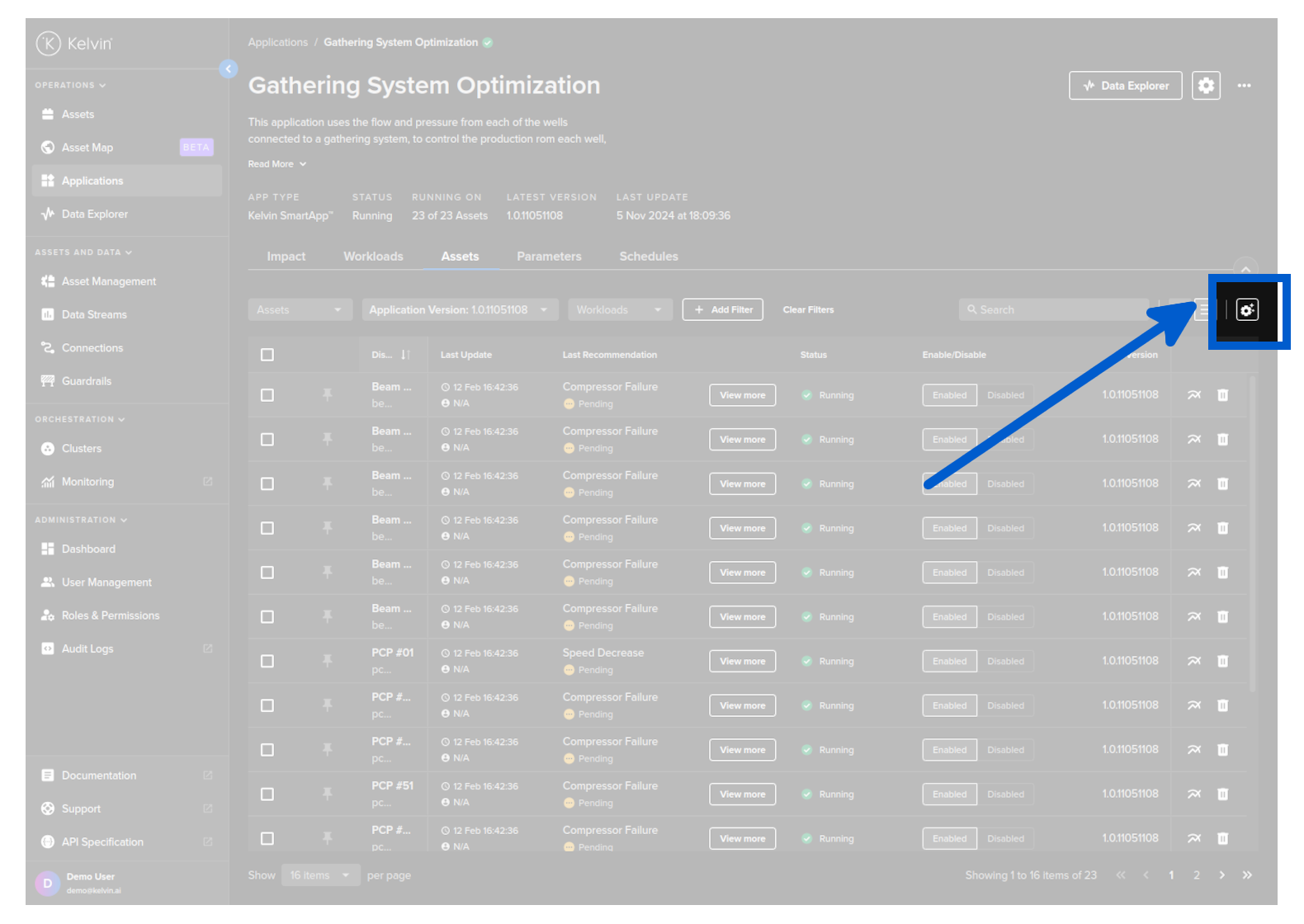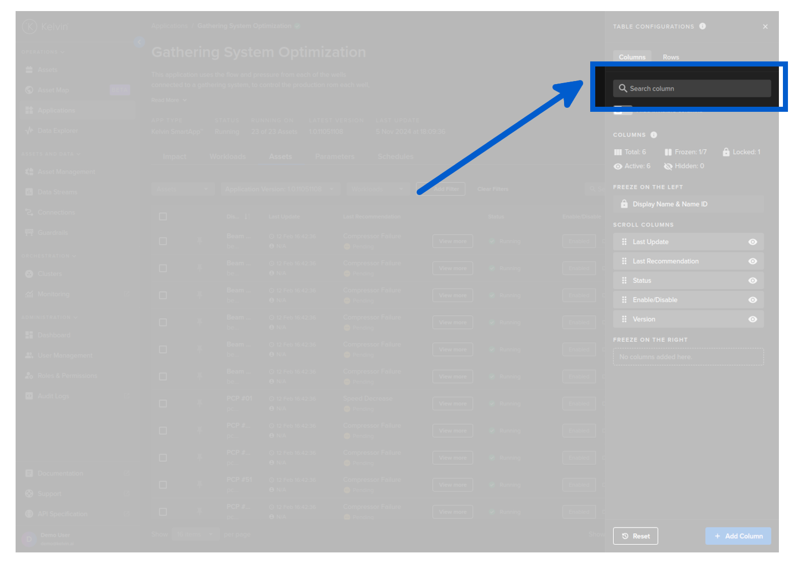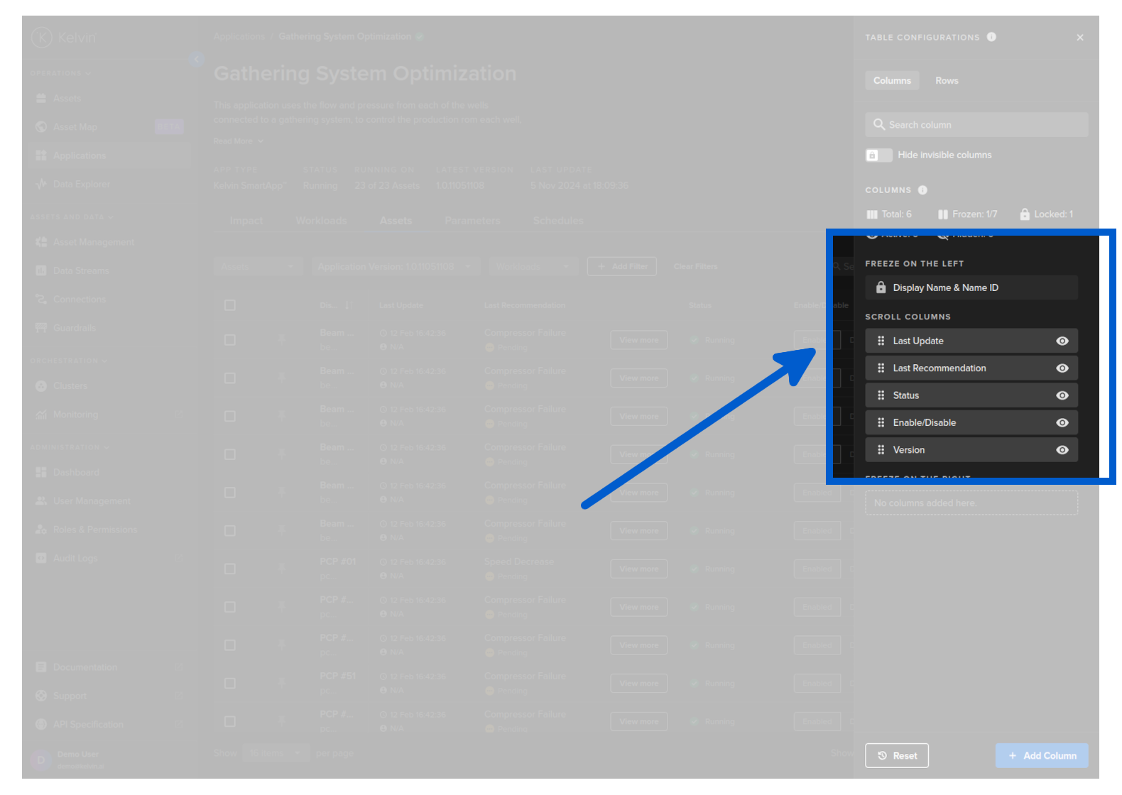 You can select which Recommendations associated with a Kelvin SmartApp™ over a defined period of time to be shown in the column for each Asset.
