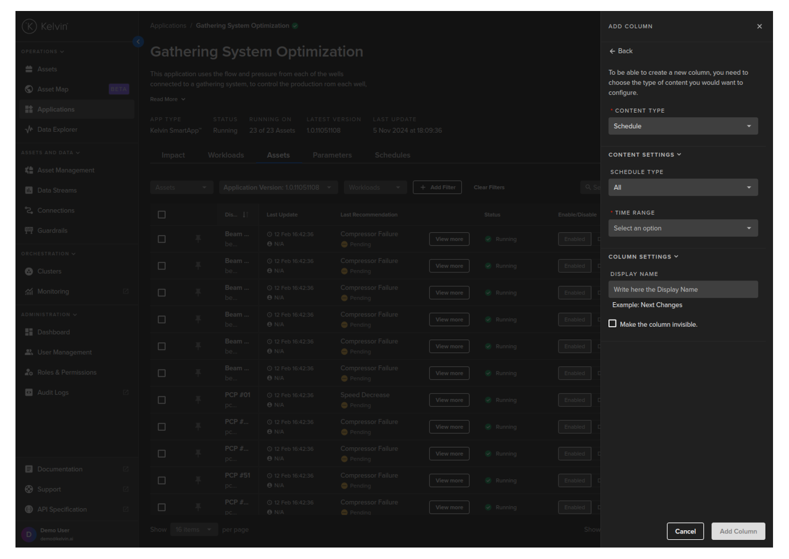 You can select which Schedule associated with a Kelvin SmartApp™ over a defined period of time to be shown in the column for each Asset.