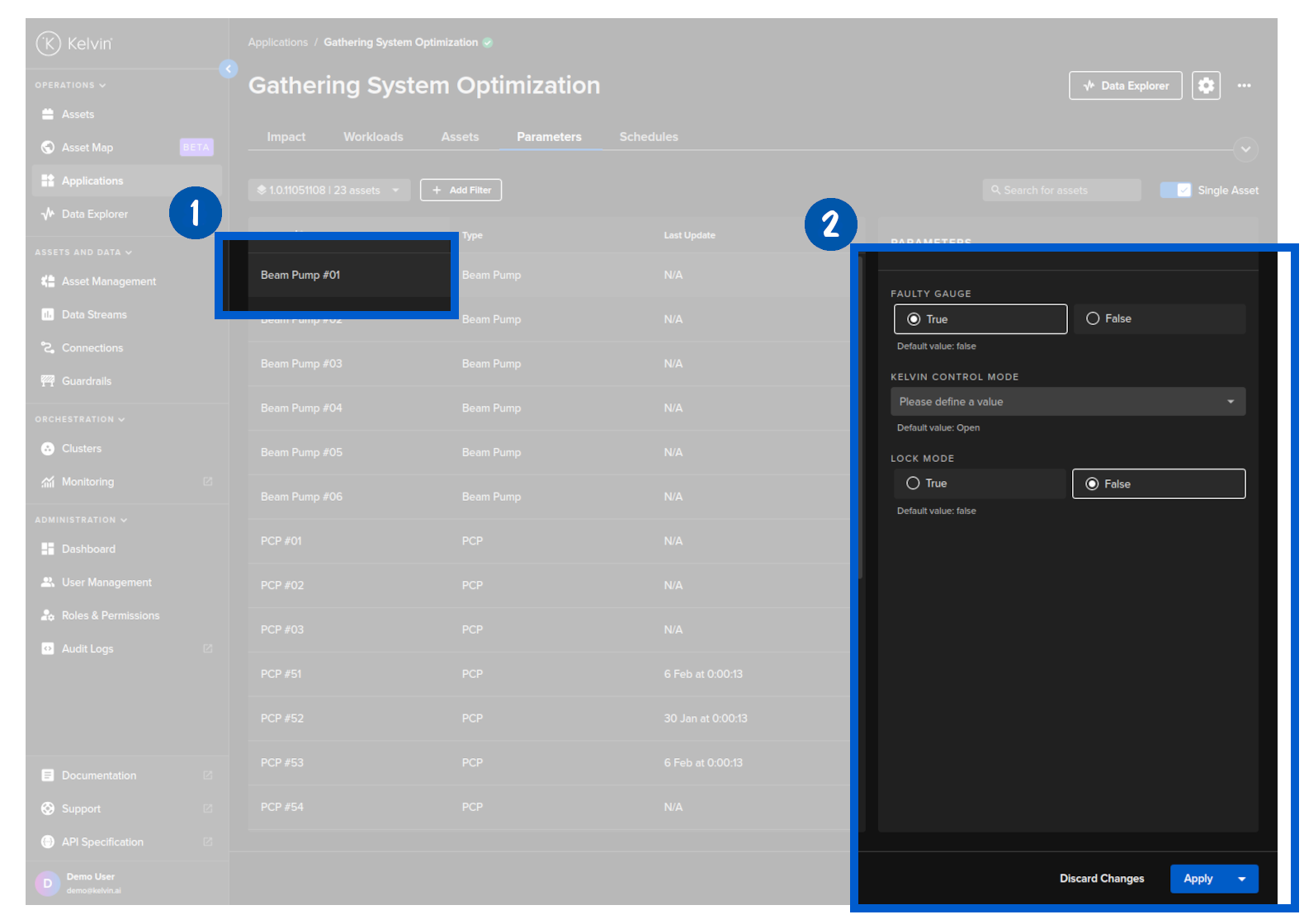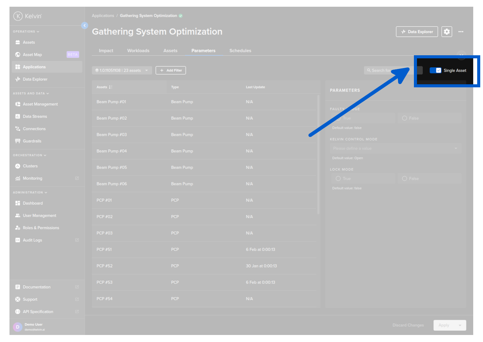 On the right hand side you will see the standard App Parameter parameters available for Kelvin SmartApps™. When you click on an Asset, then the current App Parameter values in Kelvin SmartApps™ will be shown in the App Parameters section.