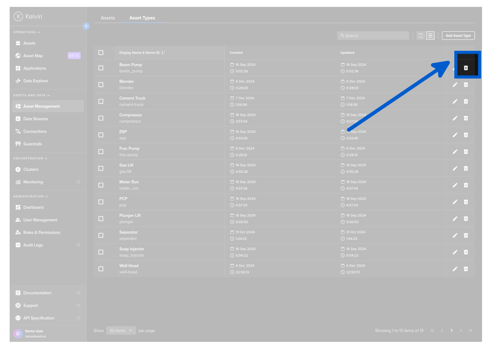 To delete an Asset Type, click on the rubbish bin icon on the right hand side of of an Asset Type row;