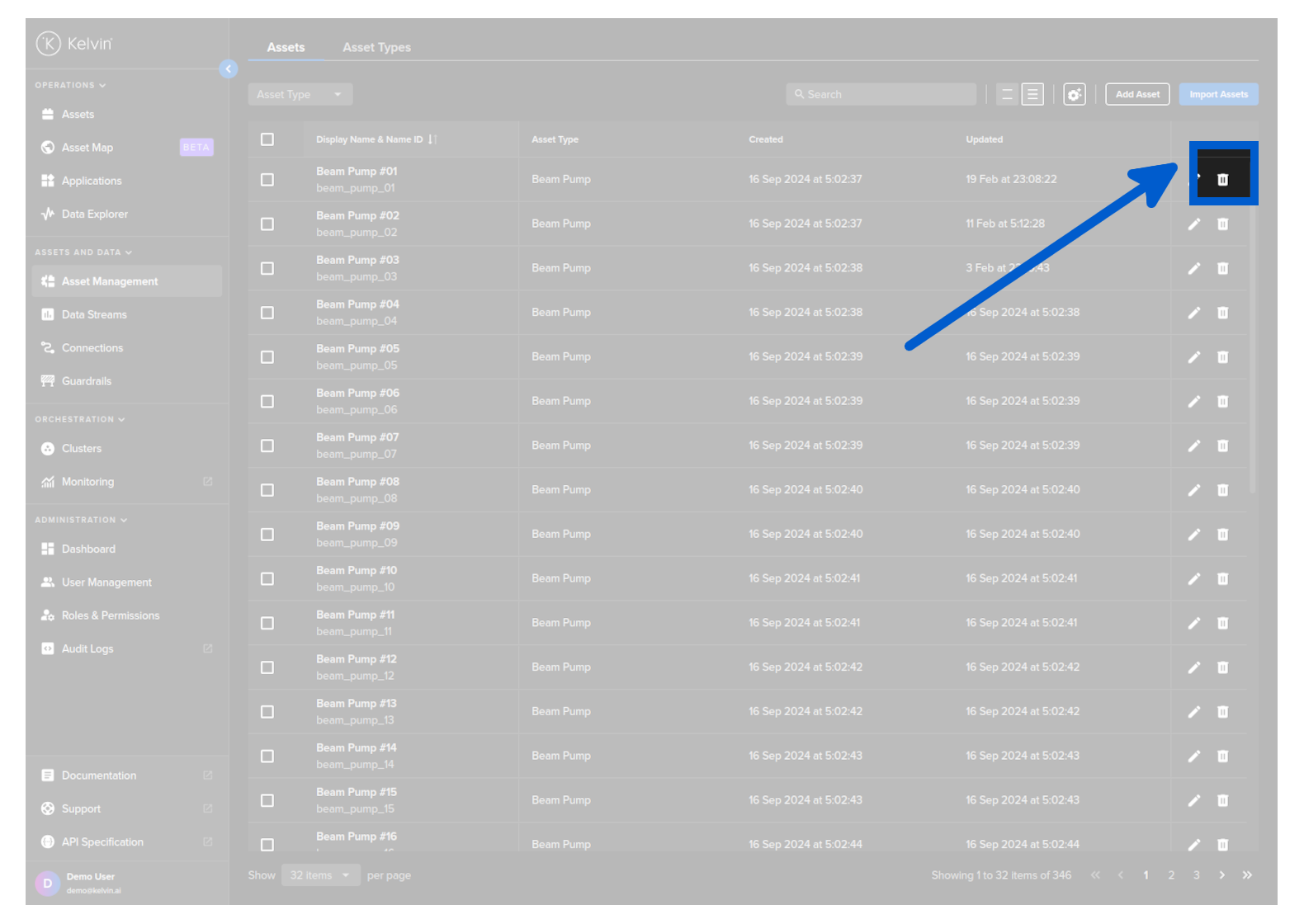 To delete an Asset, click on the rubbish bin icon on the right hand side of of an Asset row;