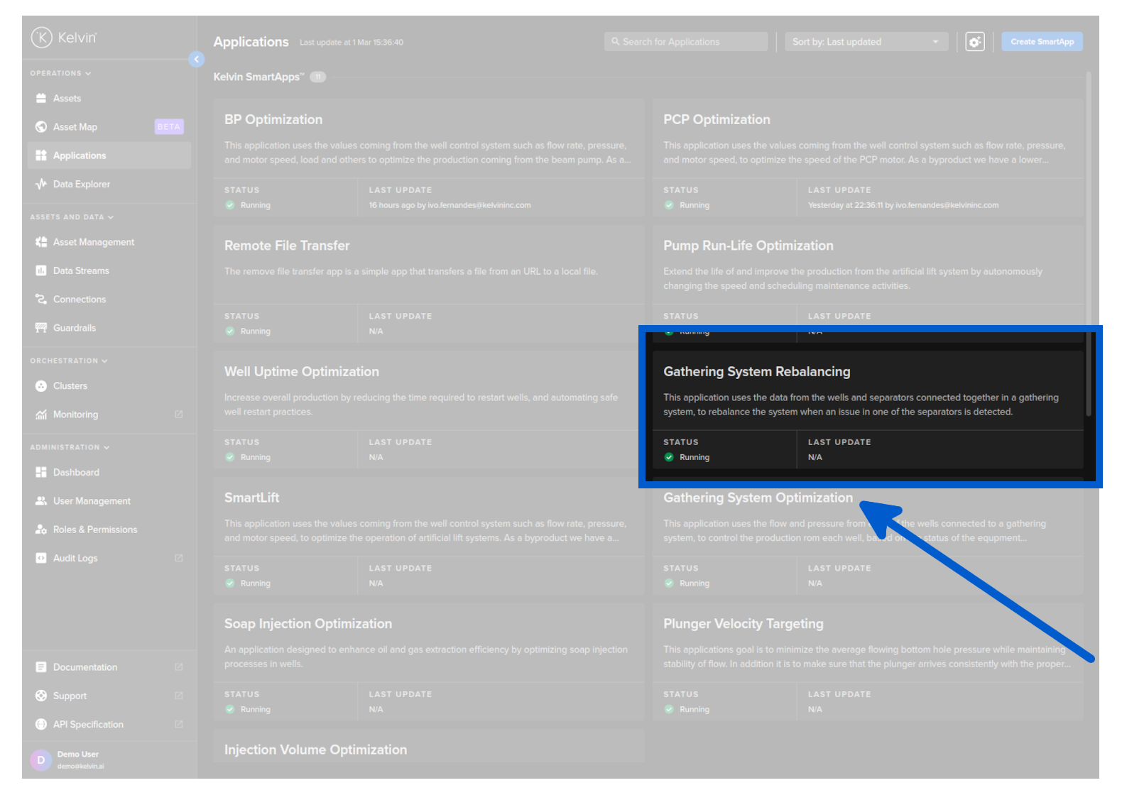 To see a full list of Assets running a certain , go to SmartApps™ dashboard page and select the Kelvin SmartApp™.