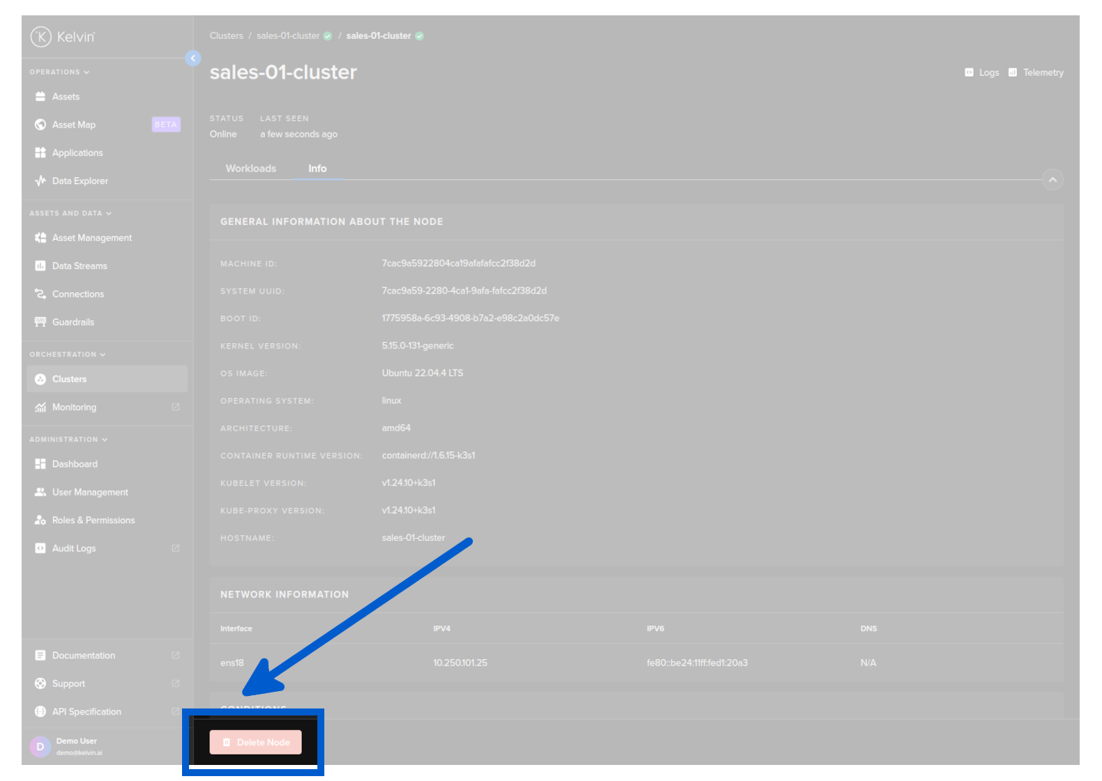 To perform this action you need to have access to the Main Node. You can find full instructions on how to delete your selected node by going to Orchestration, selecting your cluster and node, click on the Info tab and click Delete Node.