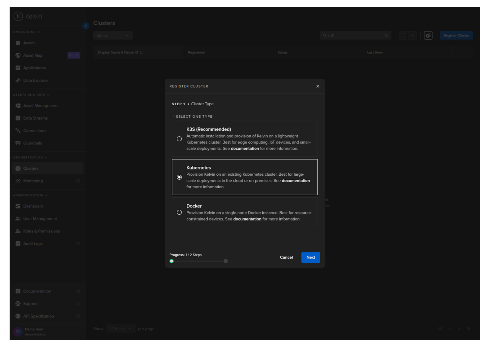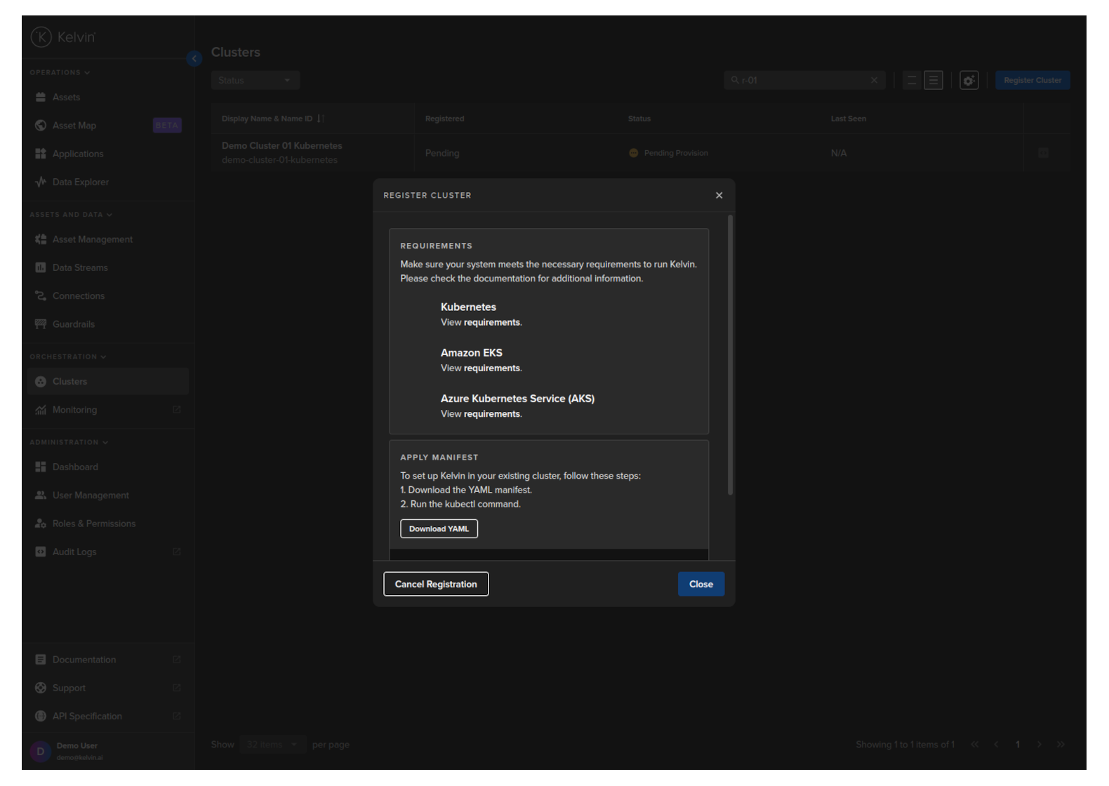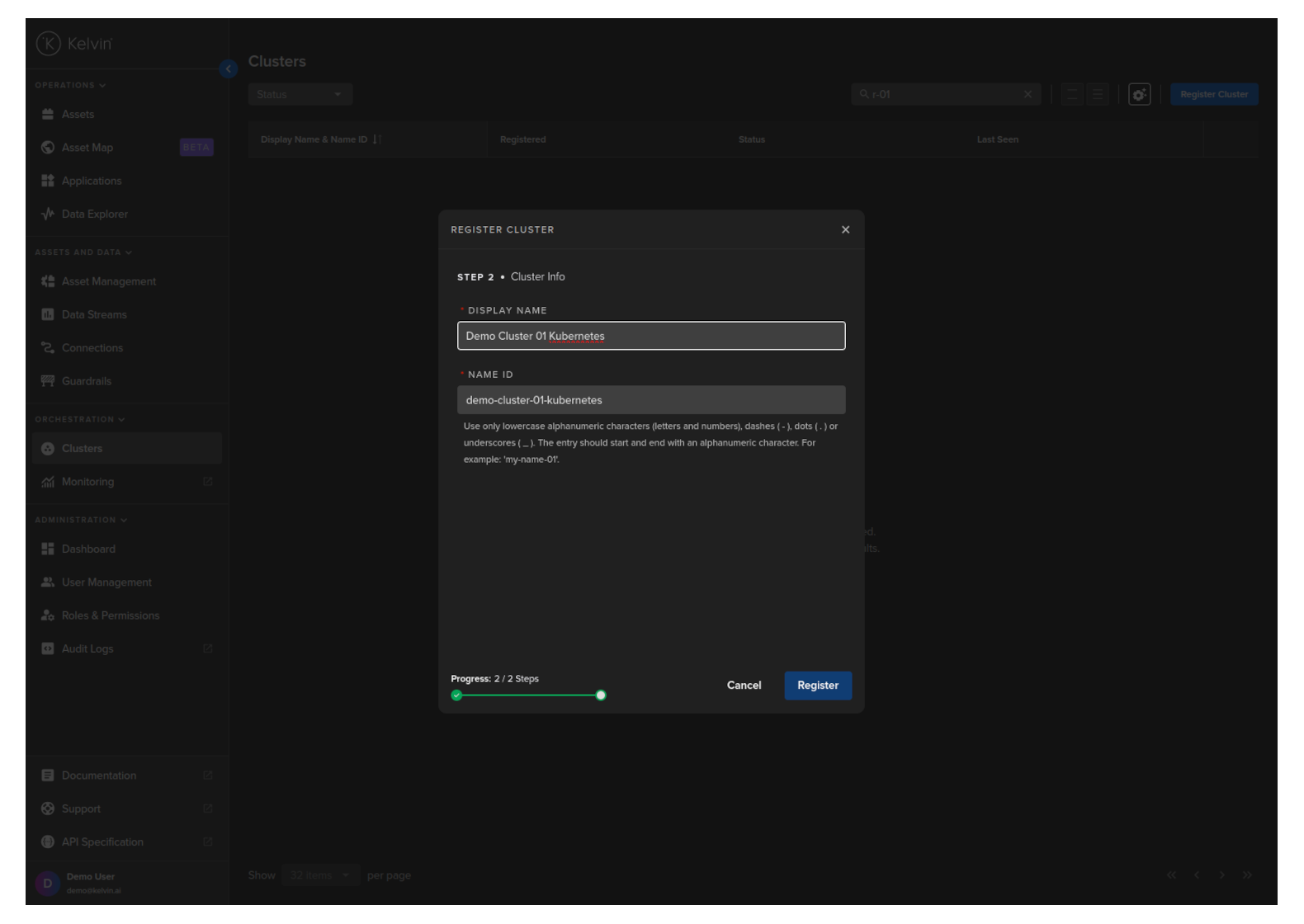 To start, go to the Orchestration page and click on the Register Cluster button;