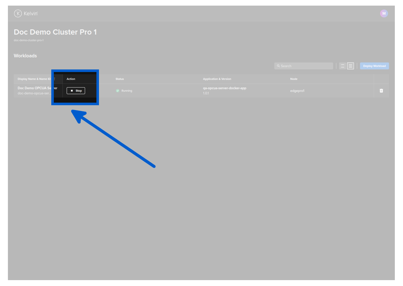 In the dashboard, find the Workload you want to control and then click the button in the action column on that row.