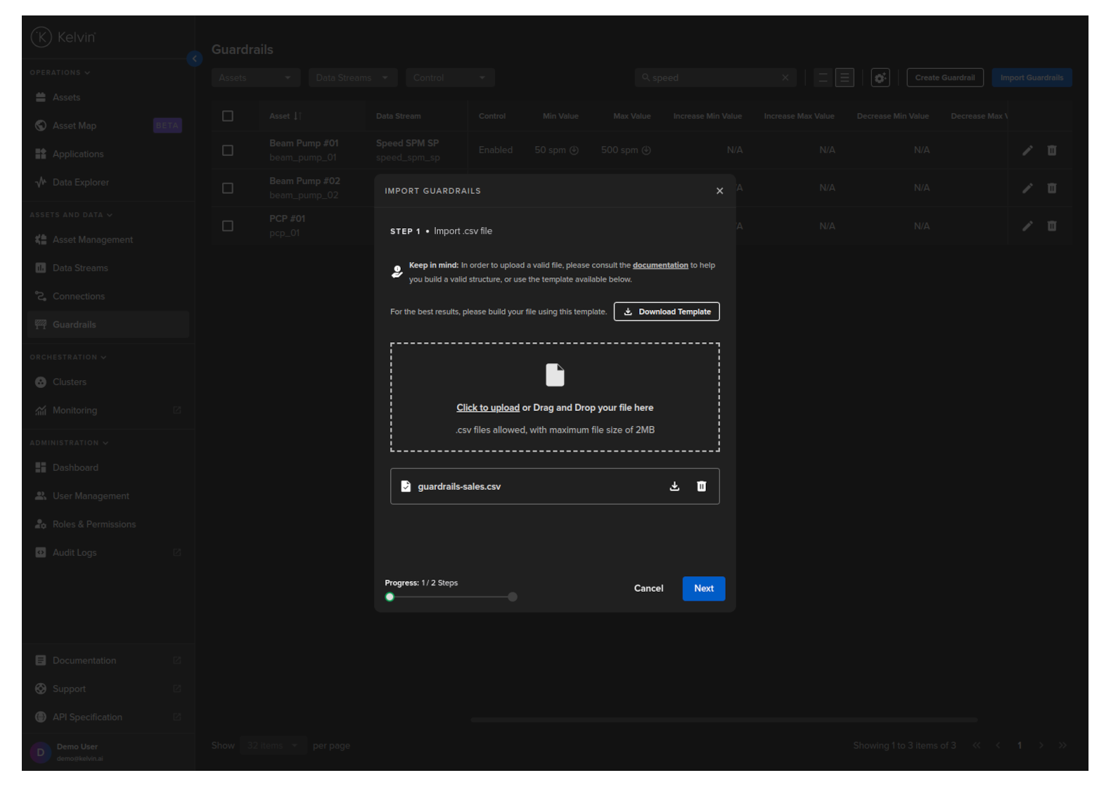 In Step 1 drag and drop your csv file of Guardrails and then click Next to go to Step 2.