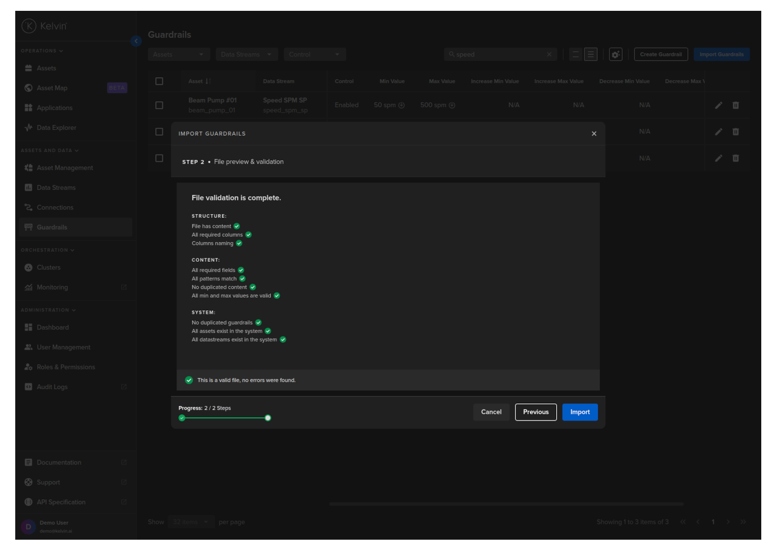Congratulations, you have imported all your Asset / Data Stream pair guardrails.