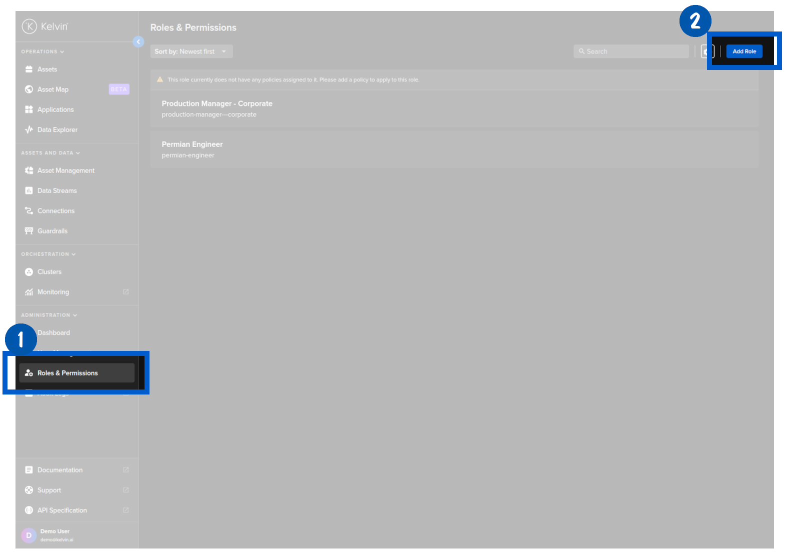 Once the user has access to the Kelvin Platform, the Administrators can assign what rights the user has through Permissions and Policies.
