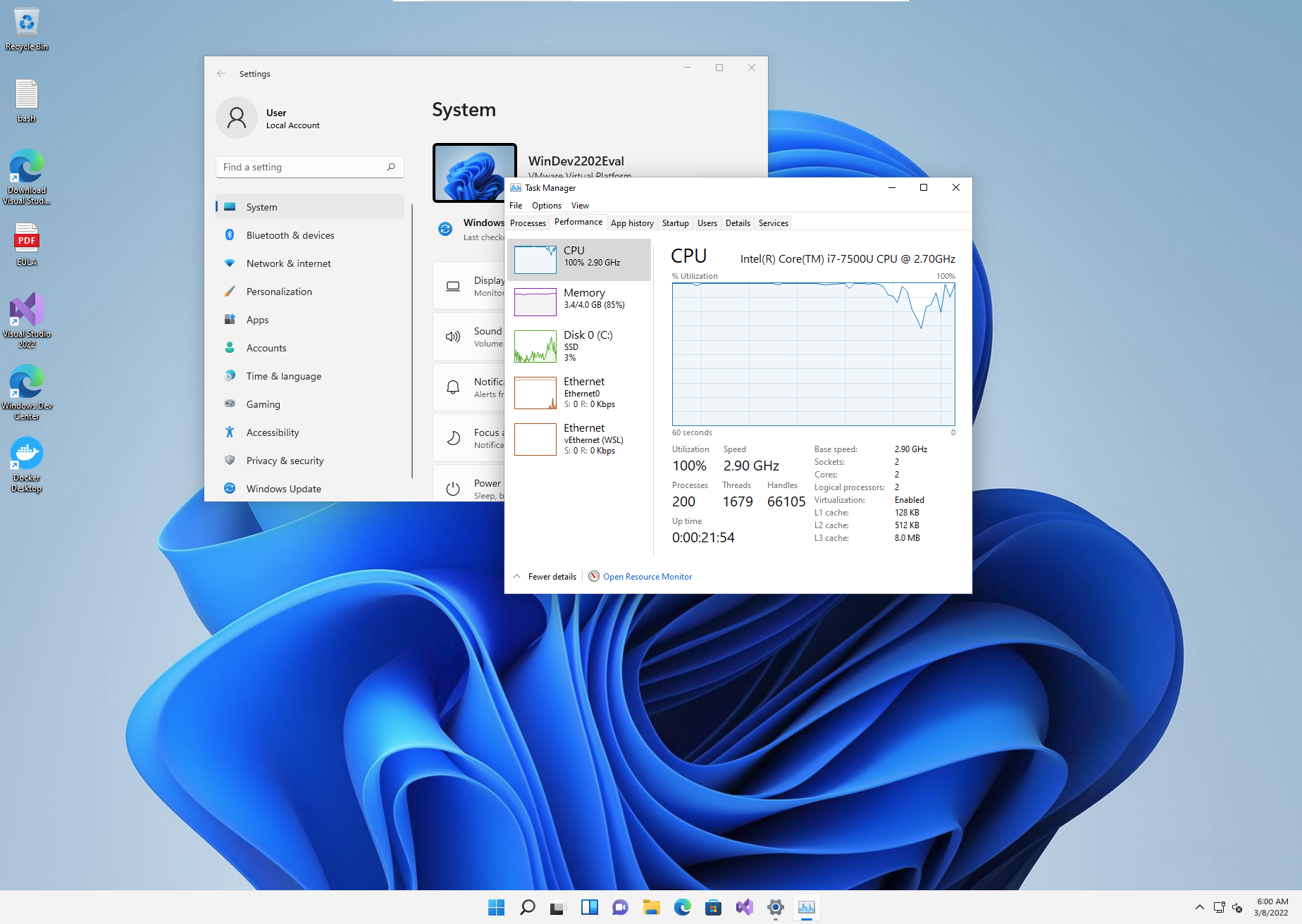 - Hardware Virtualization supported by CPU and enabled in BIOS/UEFI. To see if it is running go to Settings, search for Task Manager and click on the Performance tab. In the bottom right corner you should see "Virtualization: Enabled".