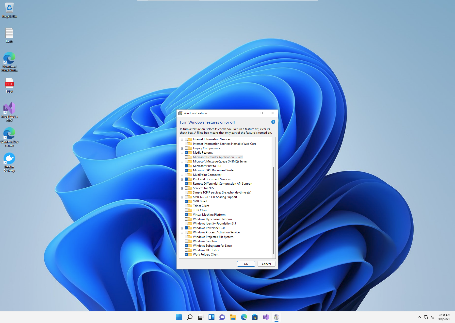 To do this, go to the start menu and search for "Turn Windows features on or off".