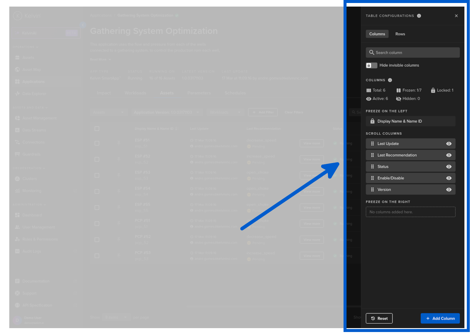 You can select which Recommendations associated with a Kelvin SmartApp™ over a defined period of time to be shown in the column for each Asset.