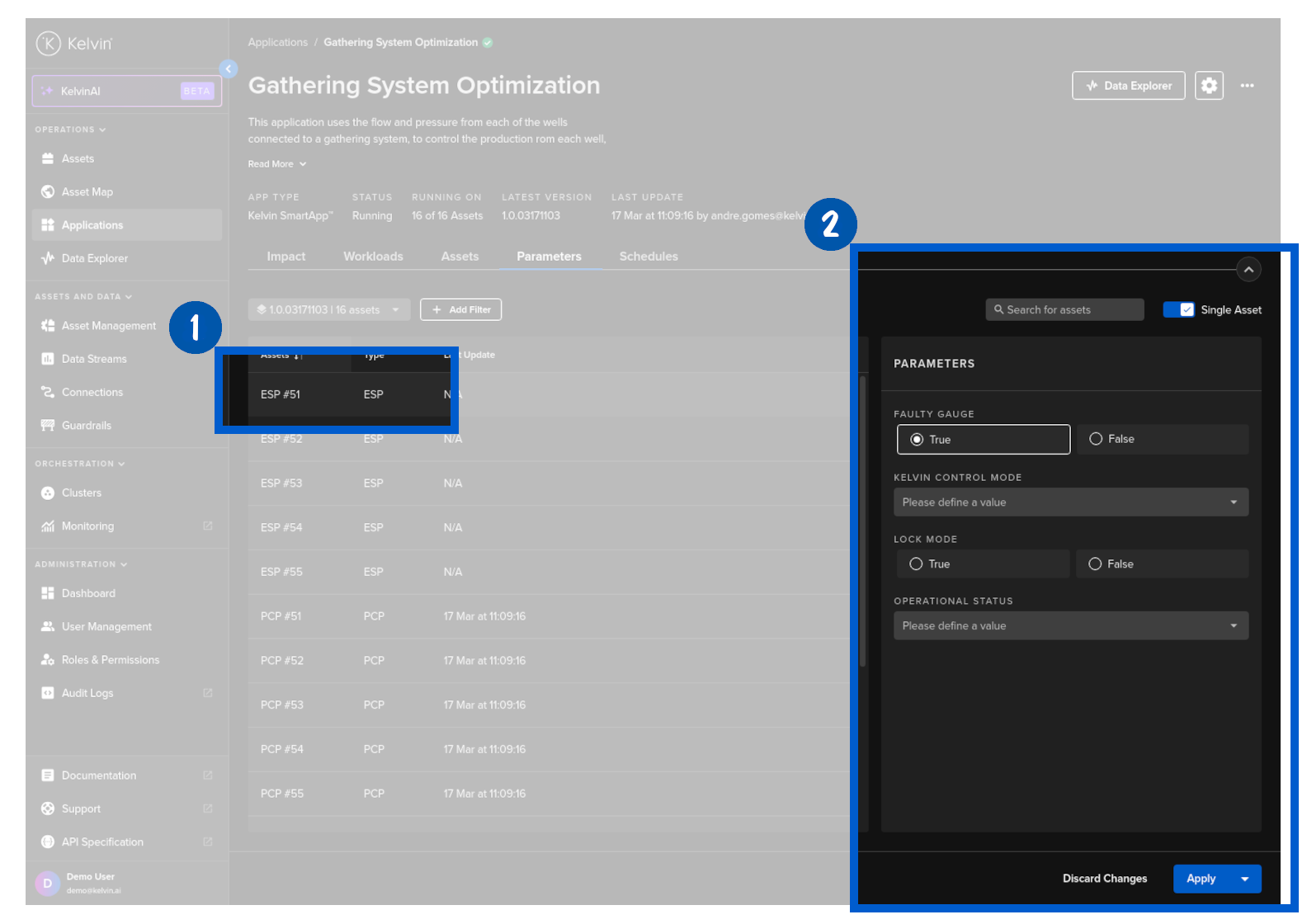 On the right hand side you will see the standard App Parameter parameters available for Kelvin SmartApps™. When you click on an Asset, then the current App Parameter values in Kelvin SmartApps™ will be shown in the App Parameters section.