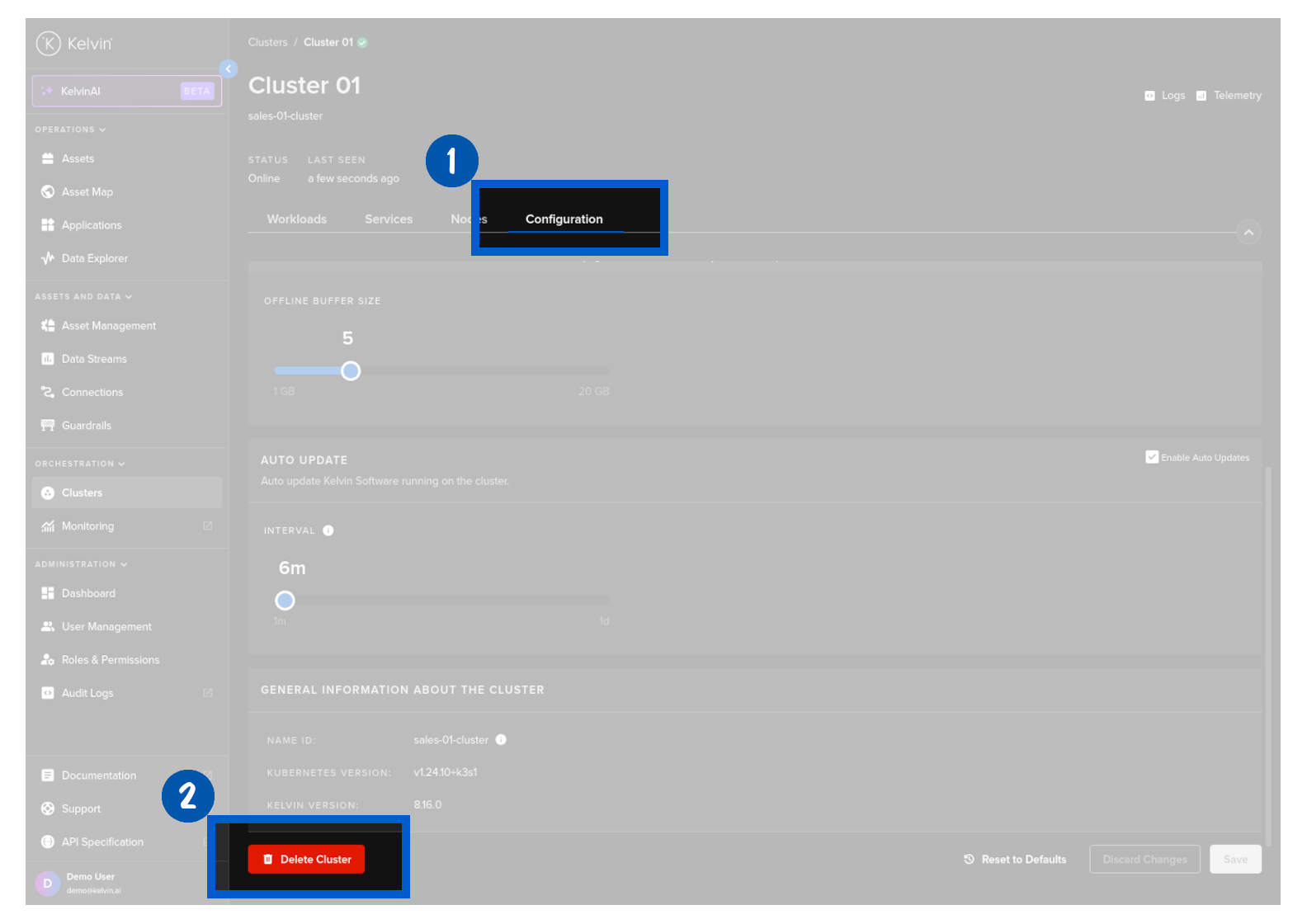 This will permanently delete all Kelvin software from the cluster including all Kelvin SmartApps™, Docker Apps and Connectors deployed to the cluster.