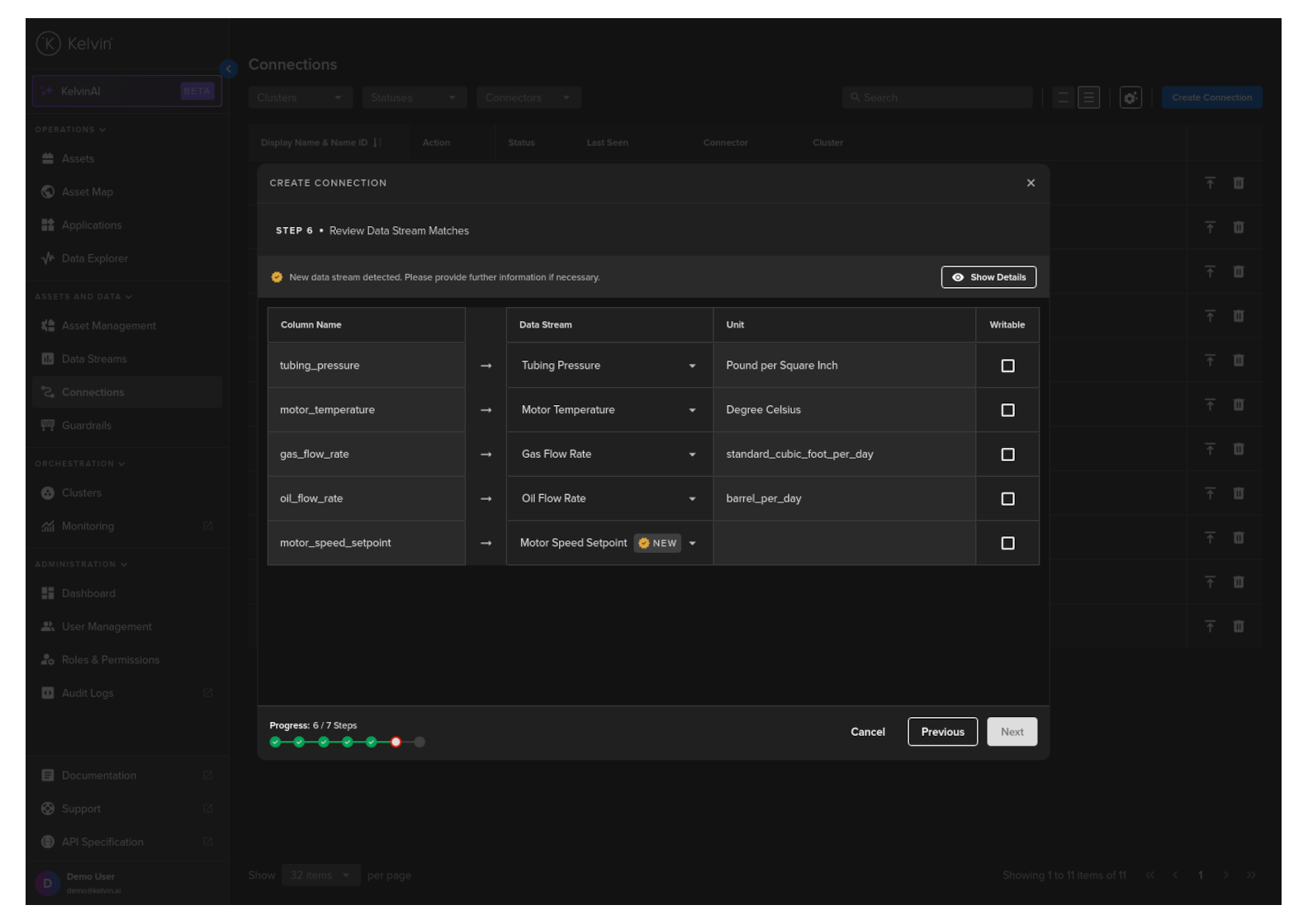 Kelvin UI will attempt to automatically select the right Data Stream based on the column name.