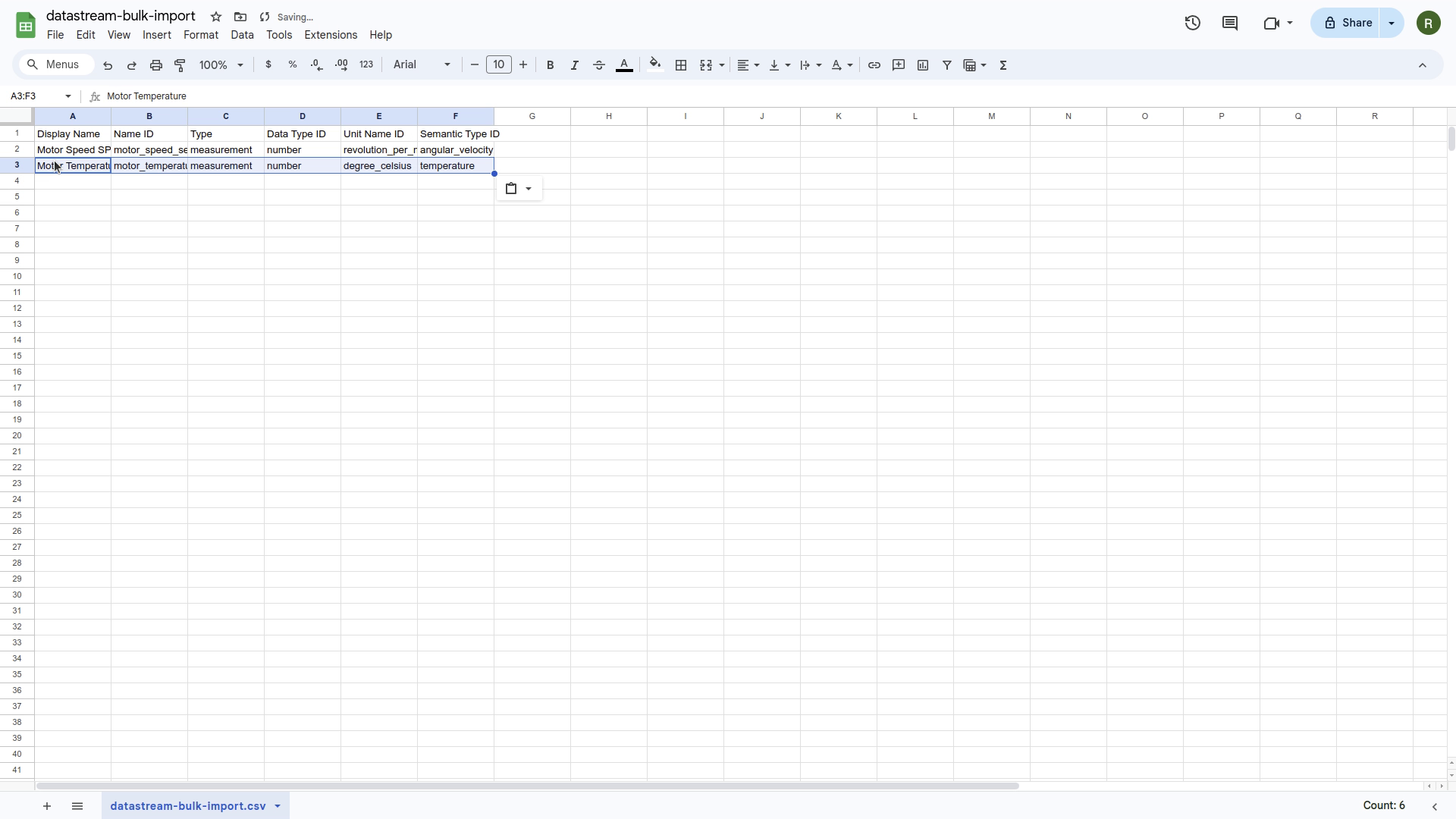 Add your data stream names in the header, and the time series data into the rows of this csv file. This is the data that will be streamed to the asset selected in the previous step. Then save the file.