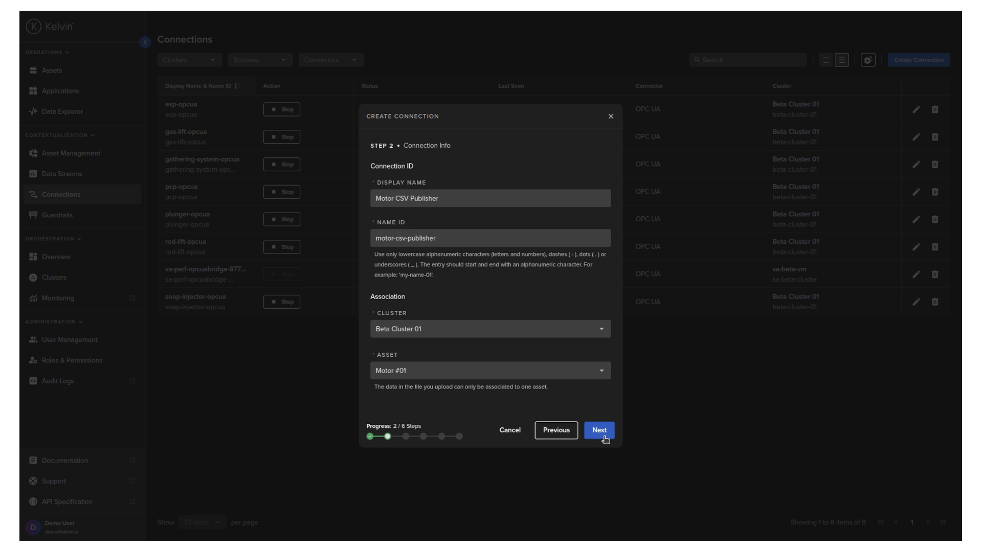 Give your CSV publisher connection a name, select the cluster where to deploy and link it to an asset, then click Next.