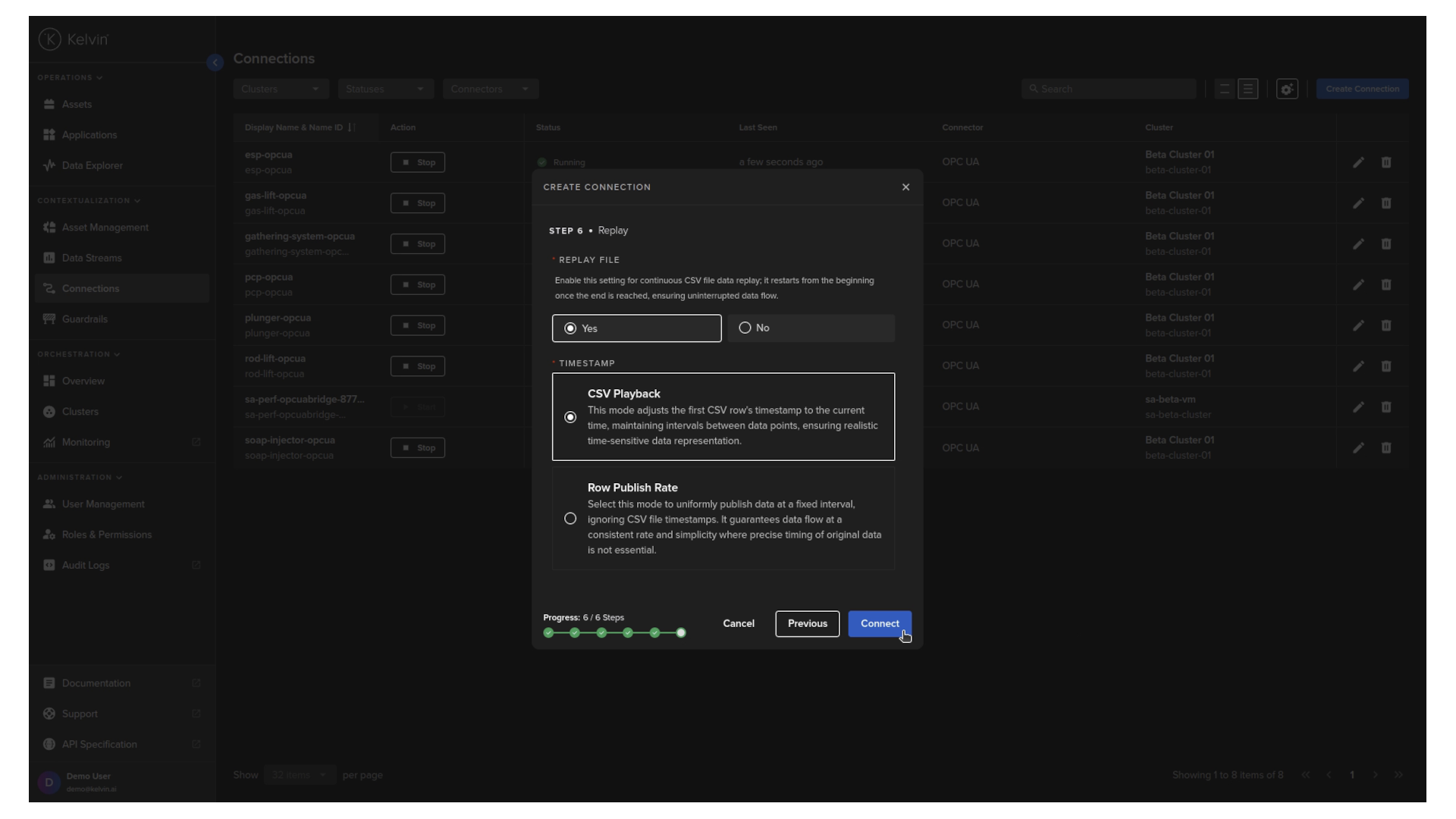 With your assets and data streams configured, you can now test your applications by establishing a connection that reads data from a CSV file and streams it directly to your apps.