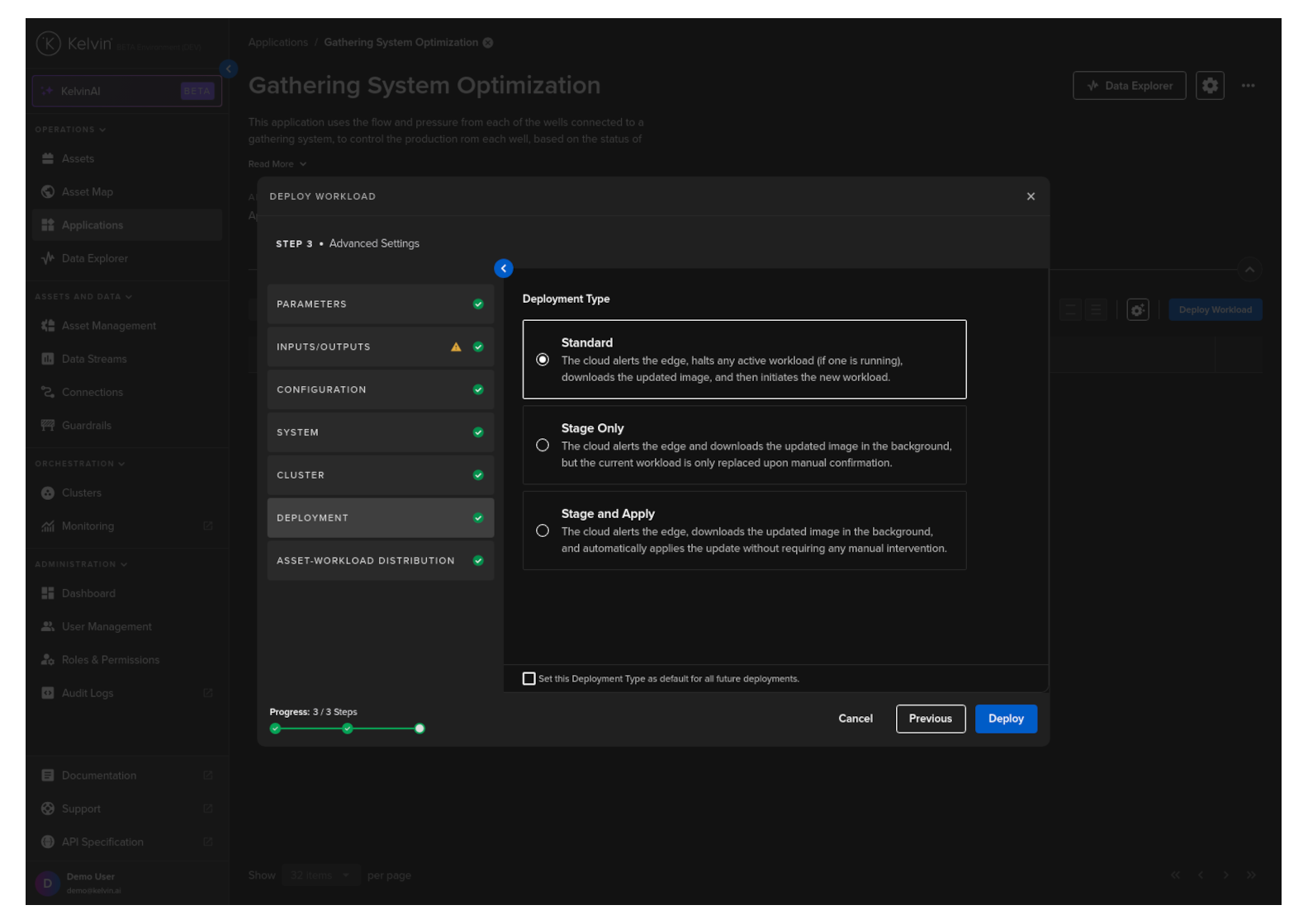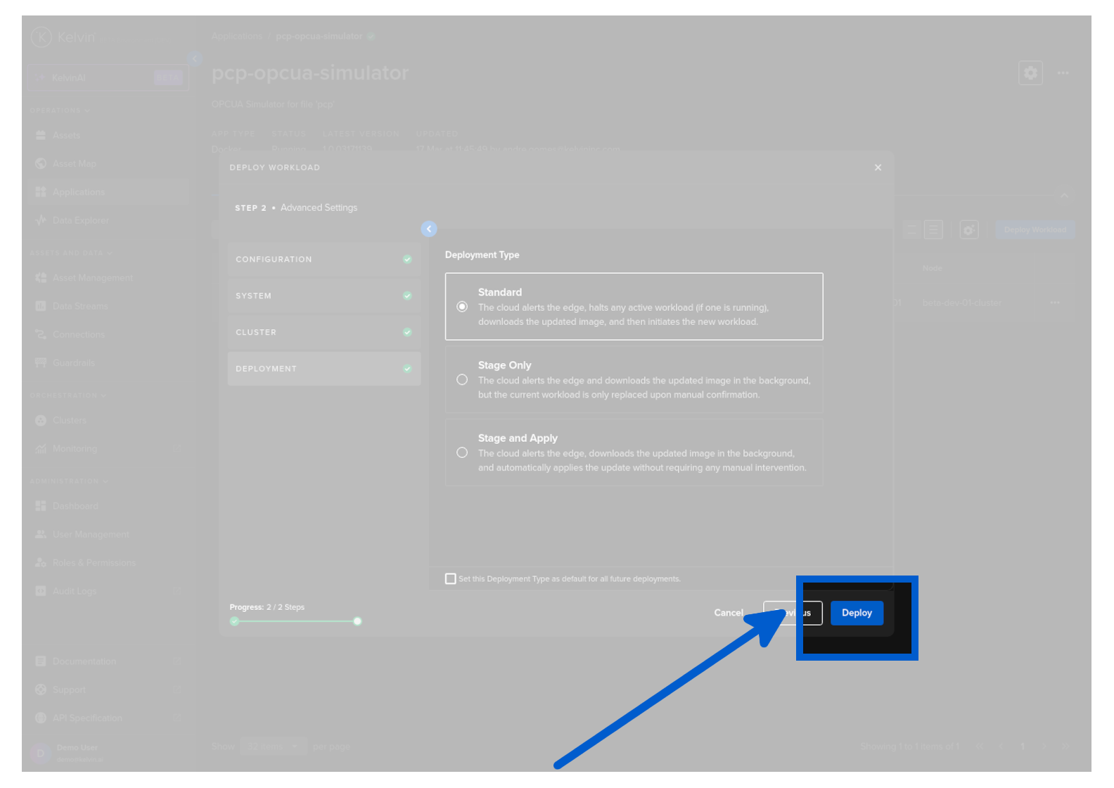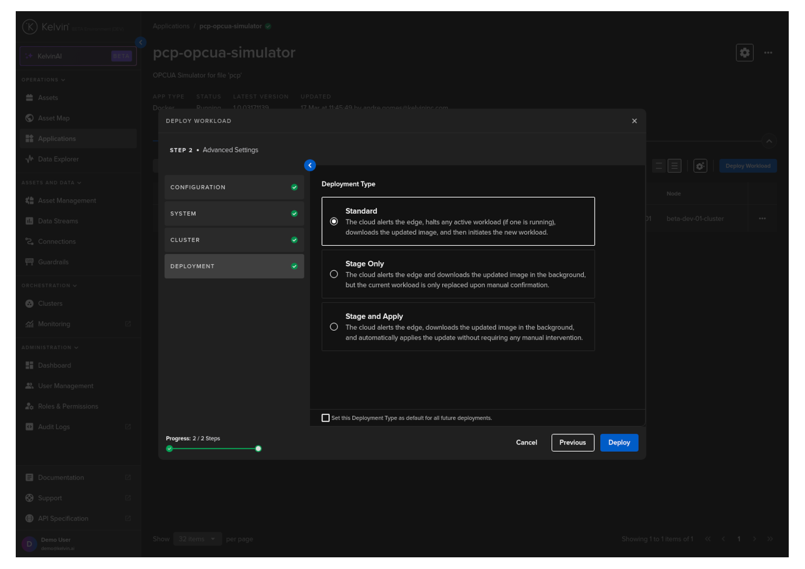 | Staged | Instant Apply | This will use Kelvin's deployment process for workload containers and the workload will be automatically started after downloaded to the edge. The difference to the Kubernetes deployment process is that Kelvin will download all workloads and stage them first. Only when all workloads have been successfully downloaded will the start command be given to all the workloads. |