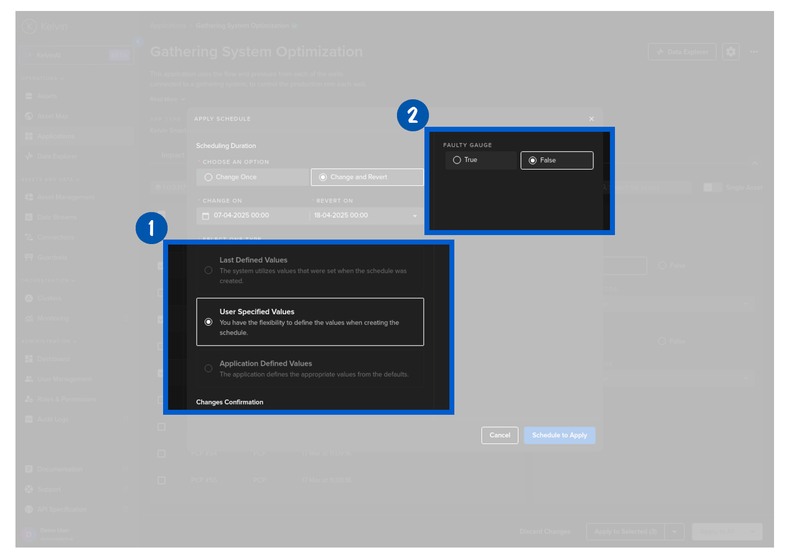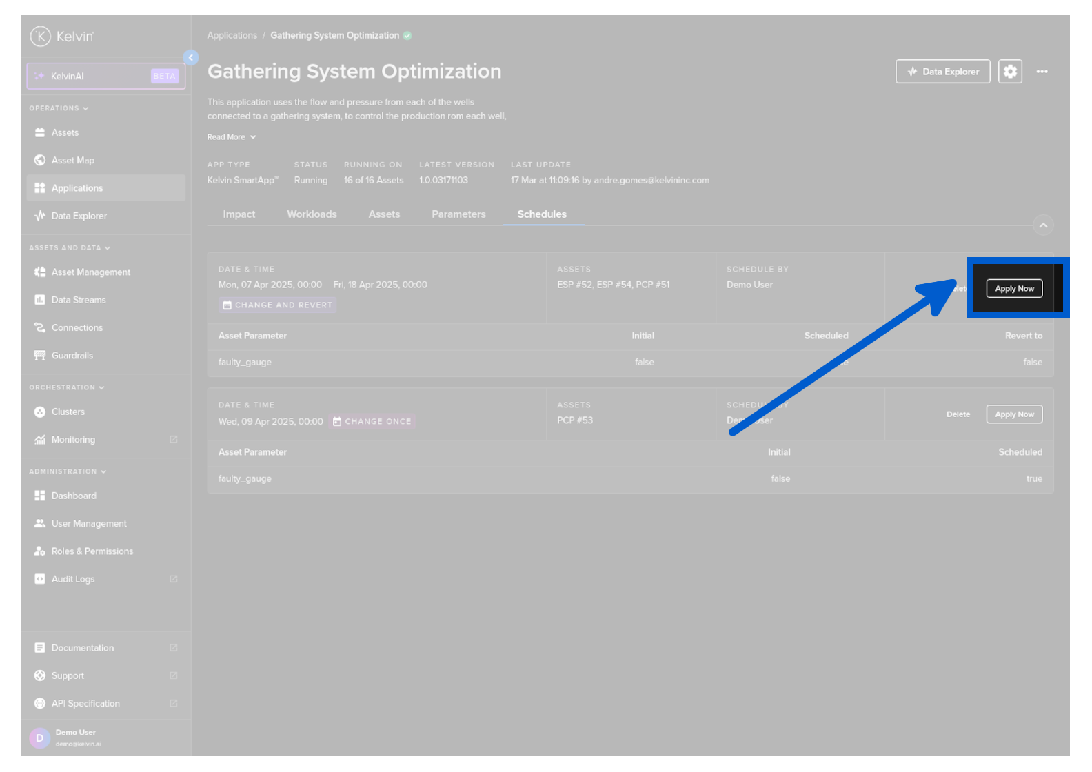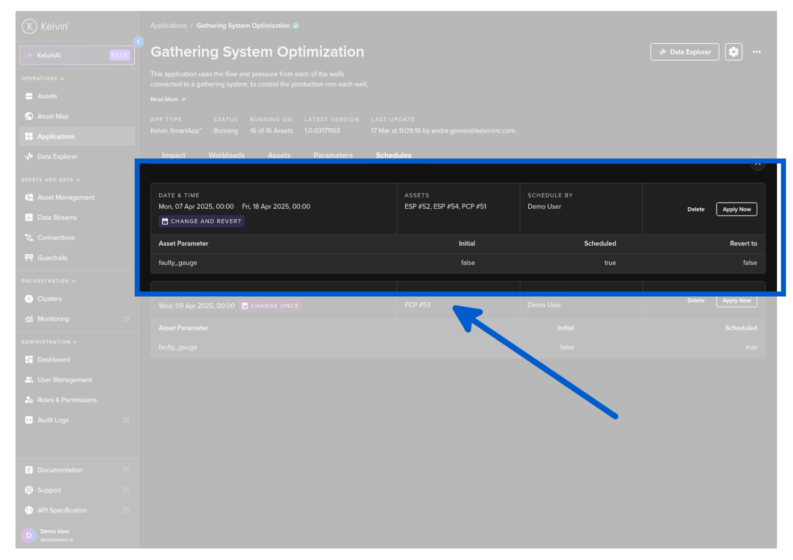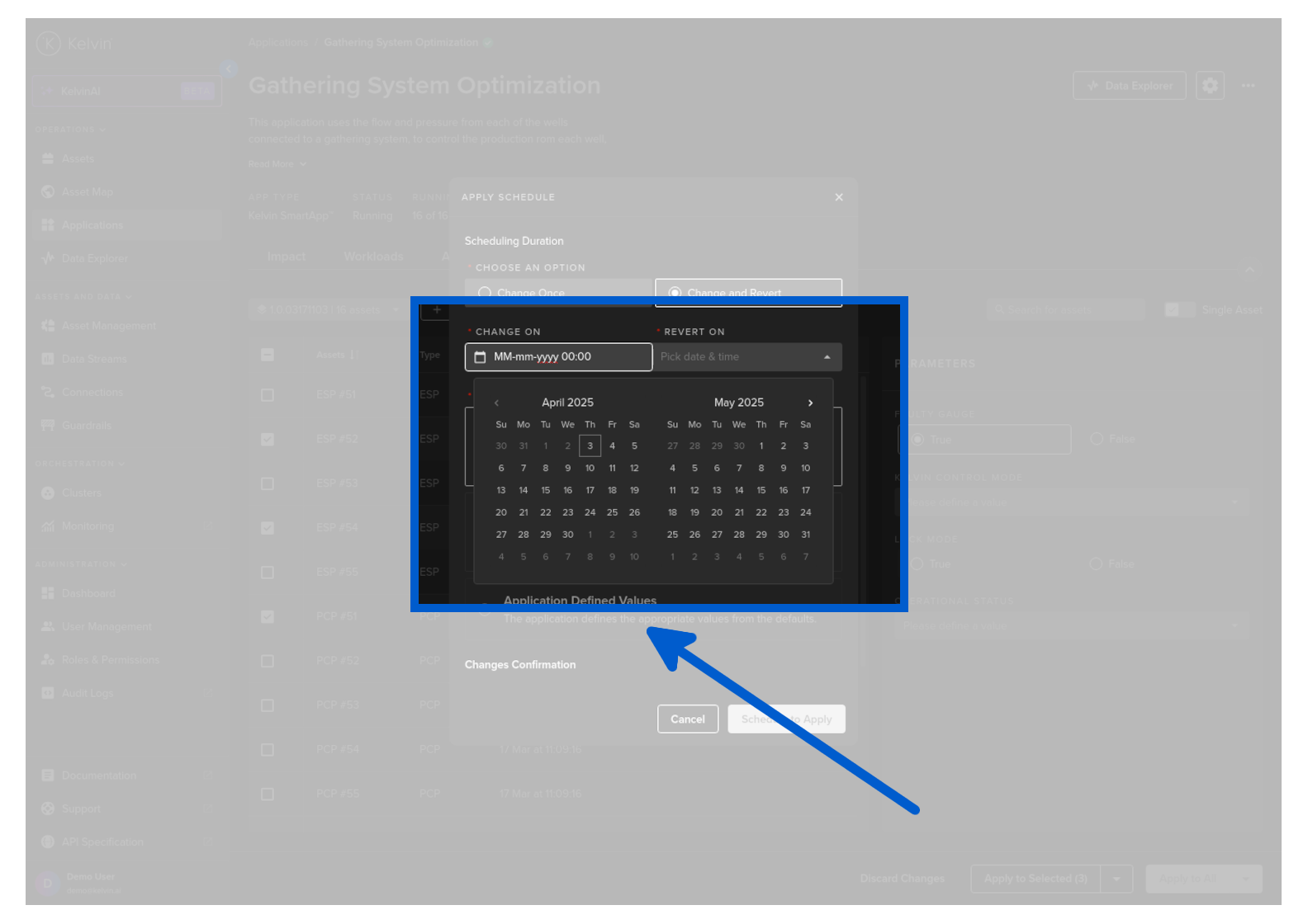 To start you can create a new schedule that will apply updated Kelvin SmartApps™ parameter values to selected asset at a defined time.