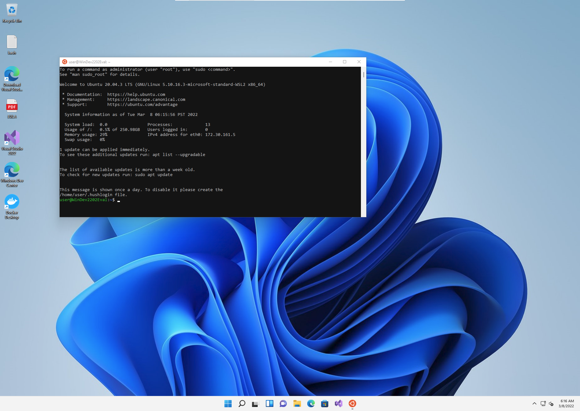 Update Ubuntu with the latest security patches (You will asked for your password. This is not the password of Windows but the username and password you created for the WSL2 Ubuntu). When finished you can close Ubuntu.