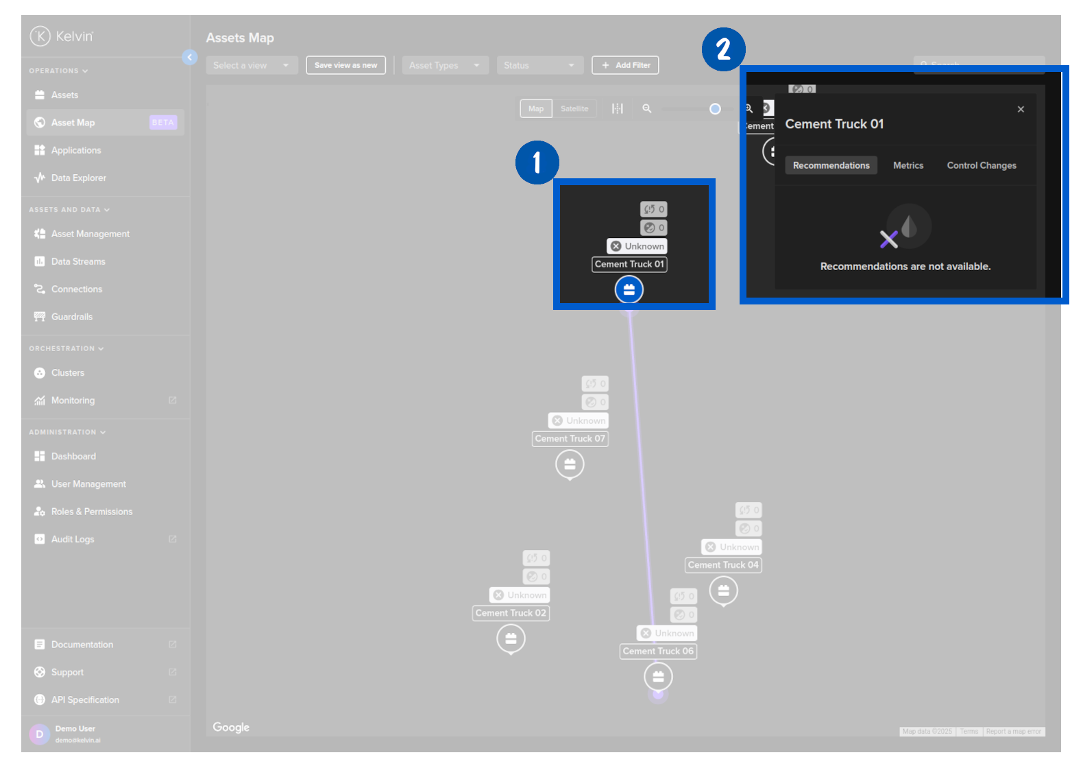 Selecting an asset on the map shows asset-specific metadata including historical control changes, current Recommendations and current Data Stream values.