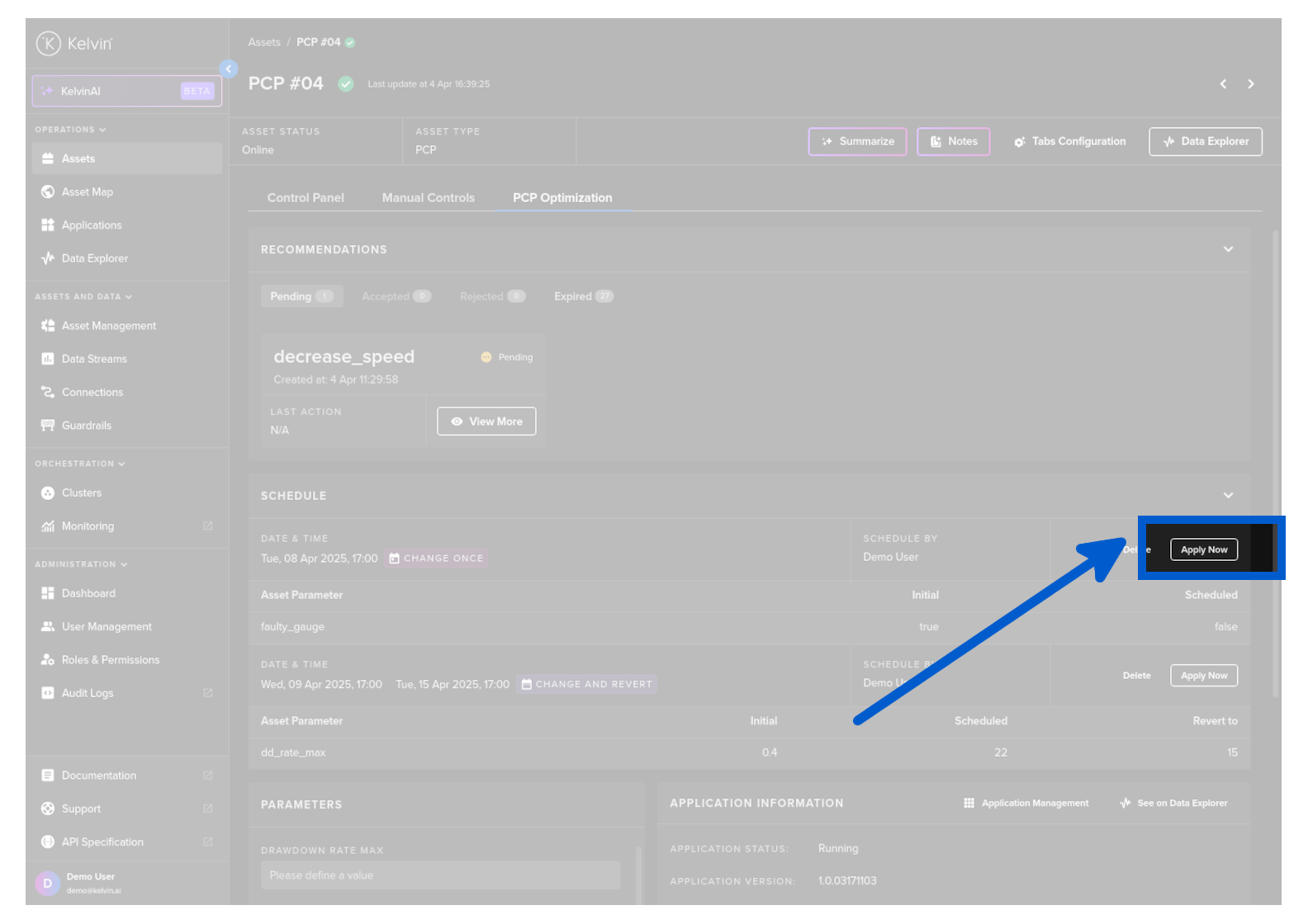 If the schedule parameter change has multiple assets to change/revert, then you can only apply/revert from Kelvin SmartApps™ page.