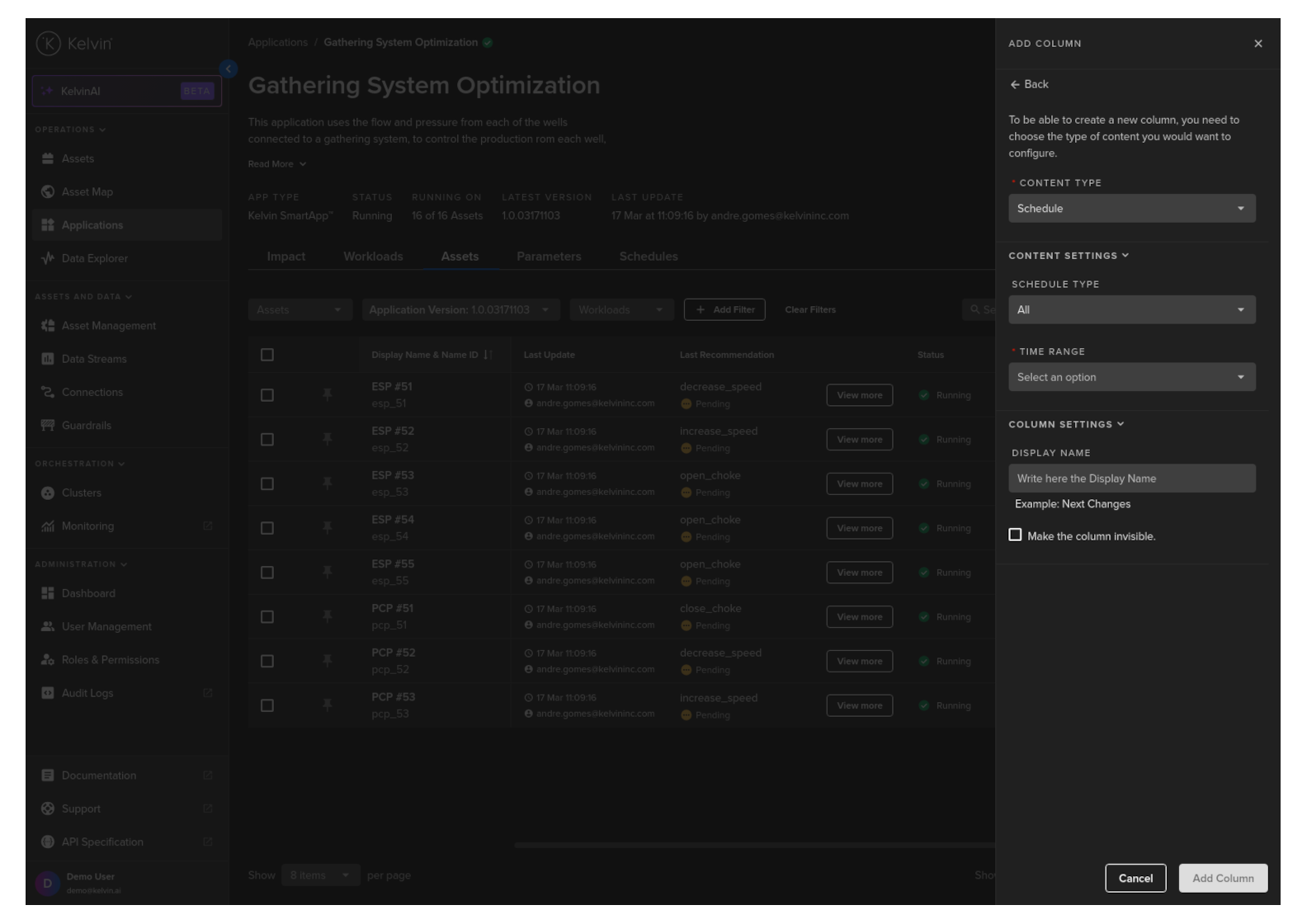 You can select which Schedule associated with a Kelvin SmartApp™ over a defined period of time to be shown in the column for each Asset.