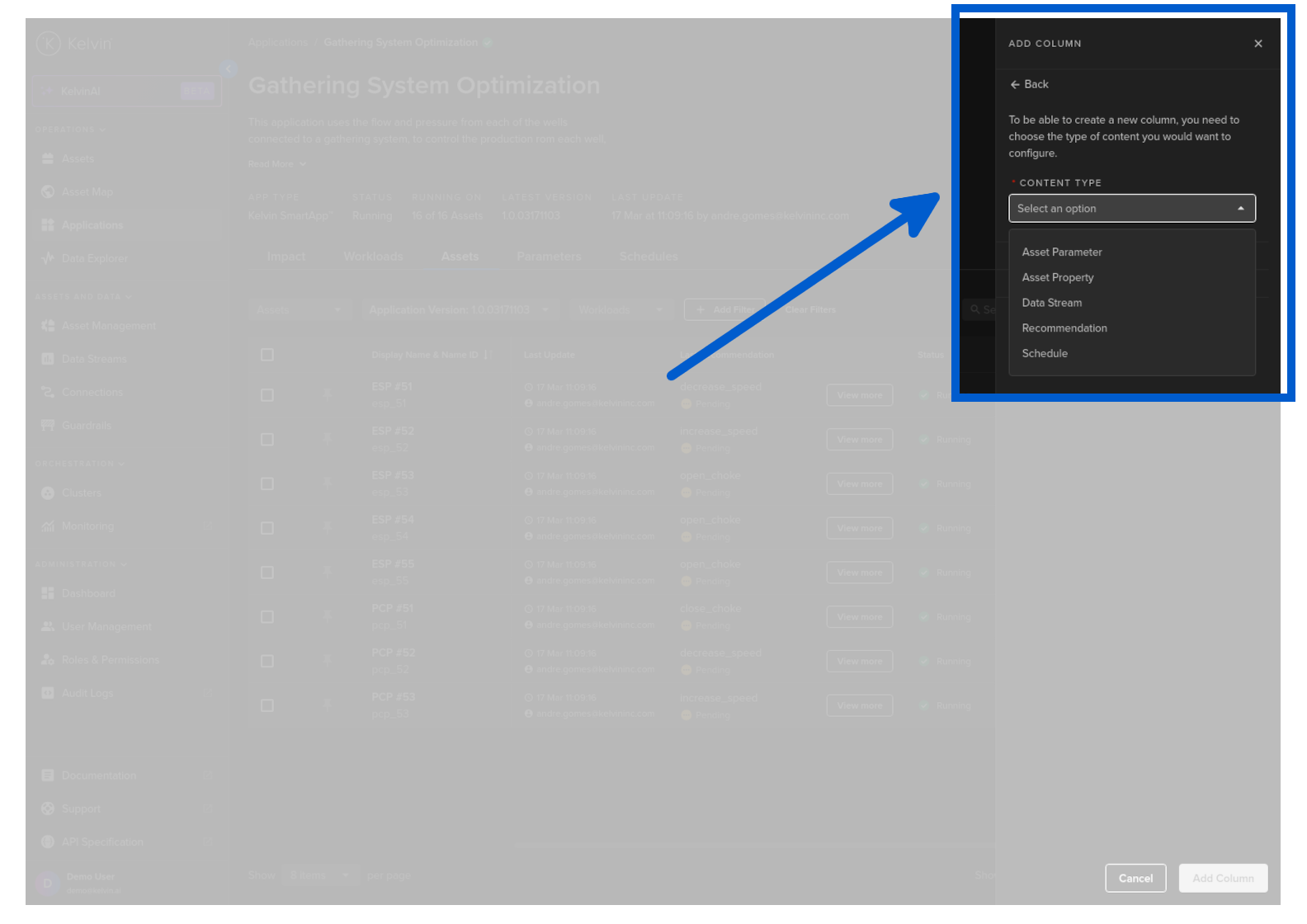You can select which Recommendations associated with a Kelvin SmartApp™ over a defined period of time to be shown in the column for each Asset.