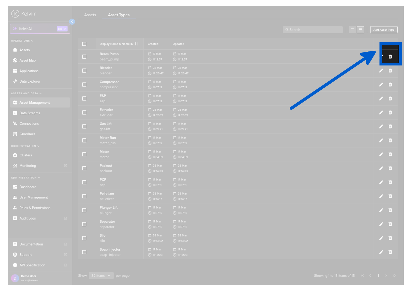 To delete an Asset Type, click on the rubbish bin icon on the right hand side of of an Asset Type row;