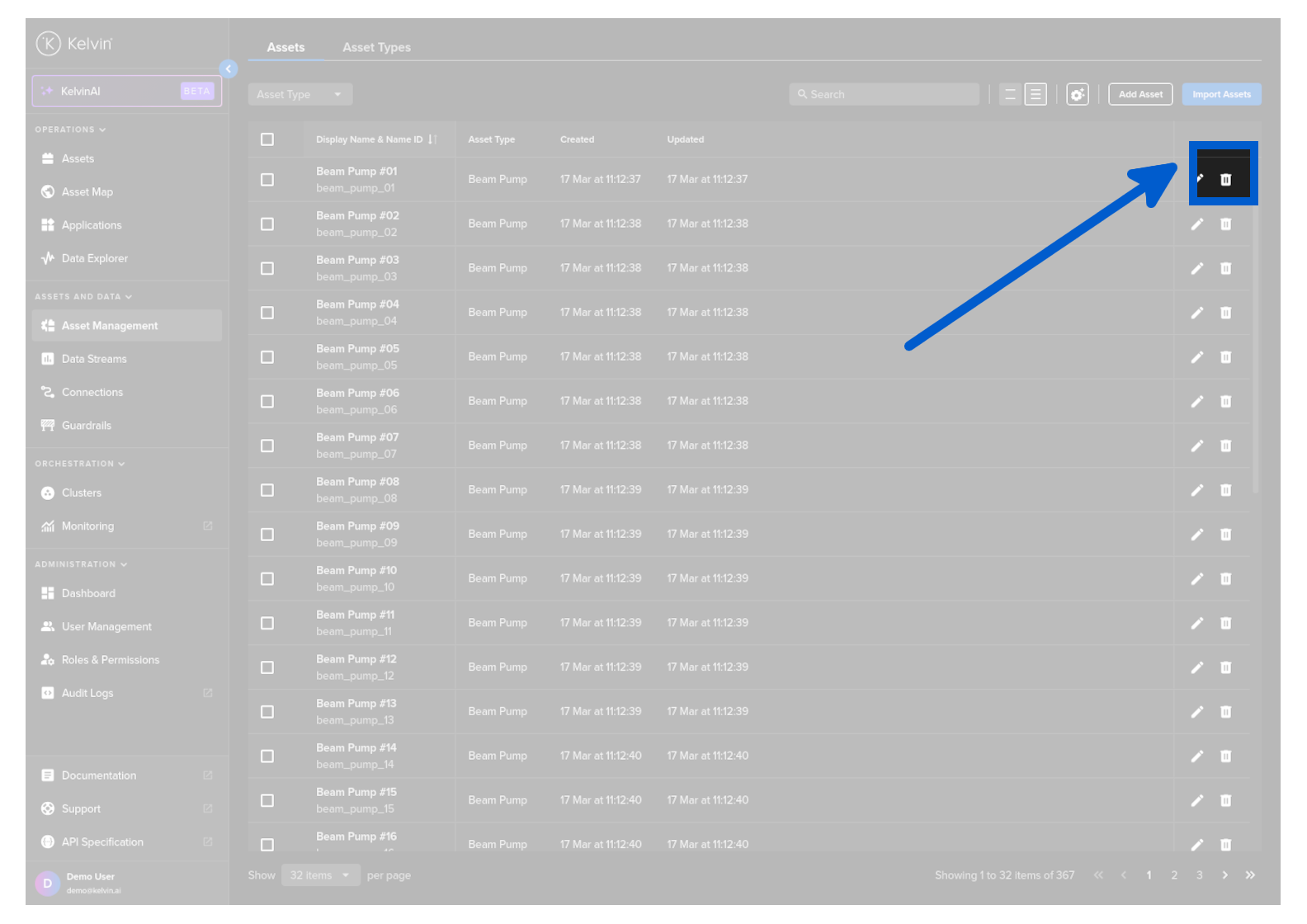 To delete an Asset, click on the rubbish bin icon on the right hand side of of an Asset row;