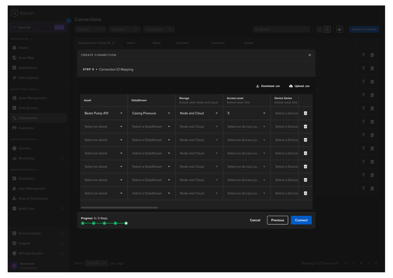 If you have many connection IO to fill in, you can save time with the download/upload csv file option in the top right hand corner of the popup.