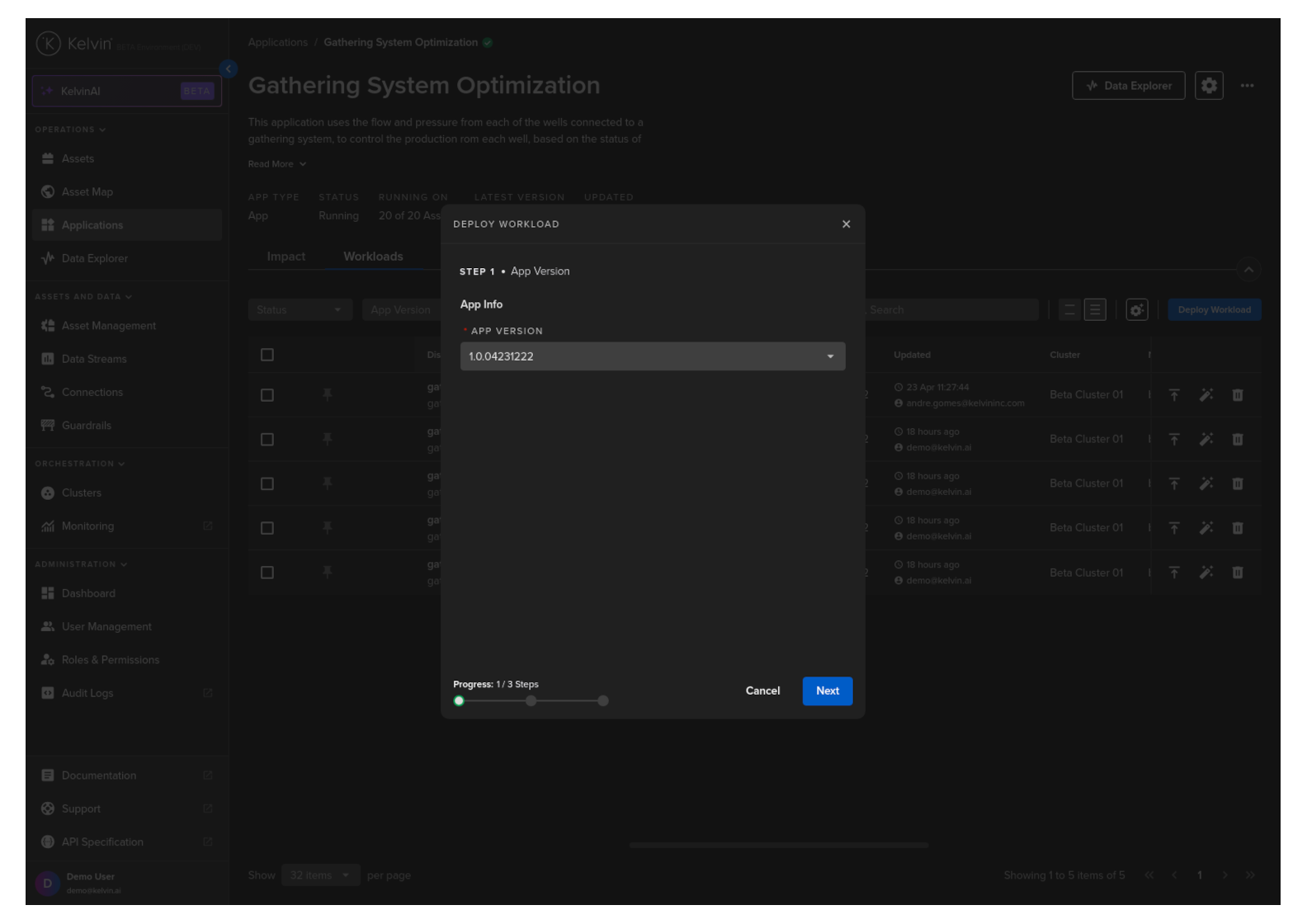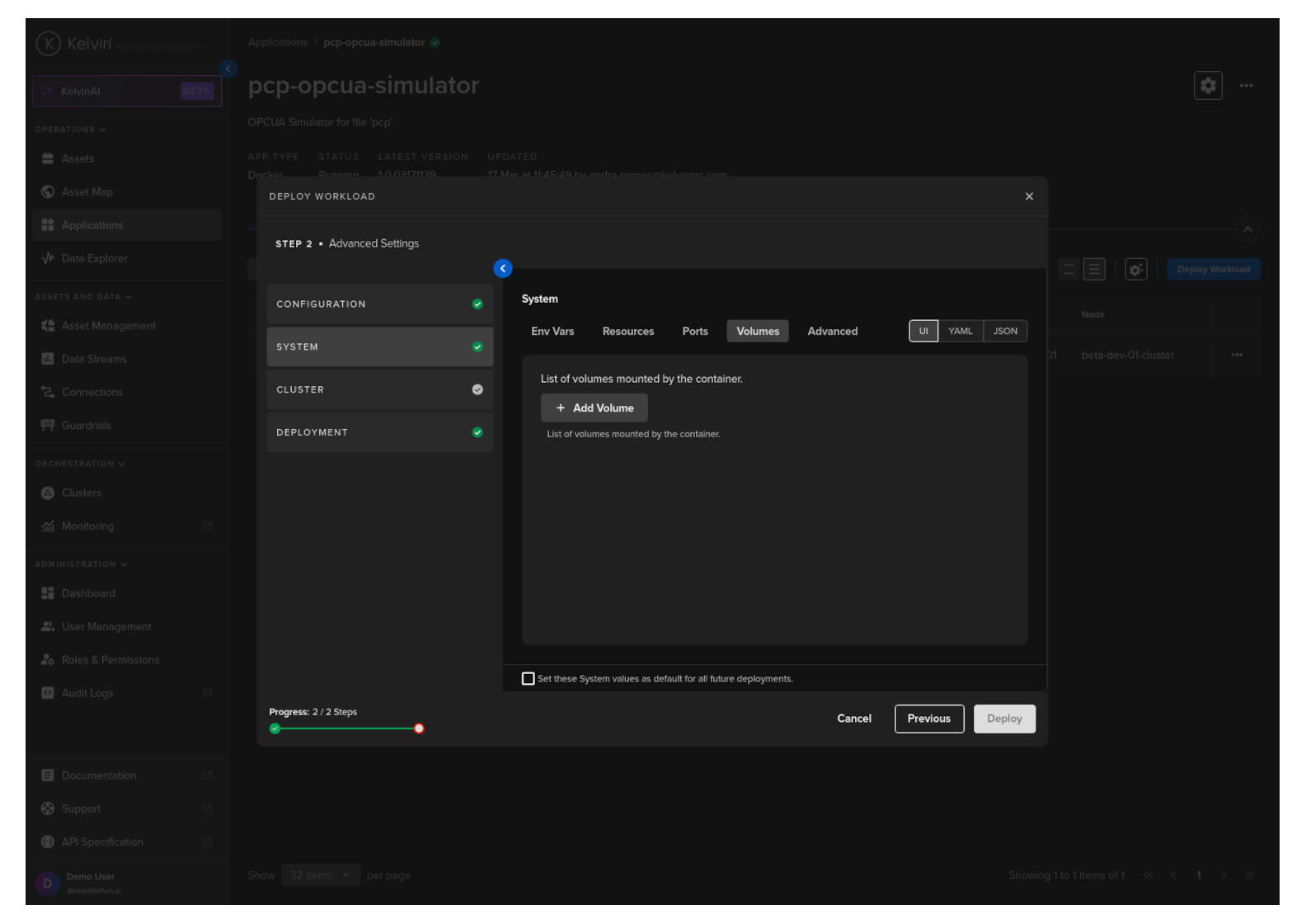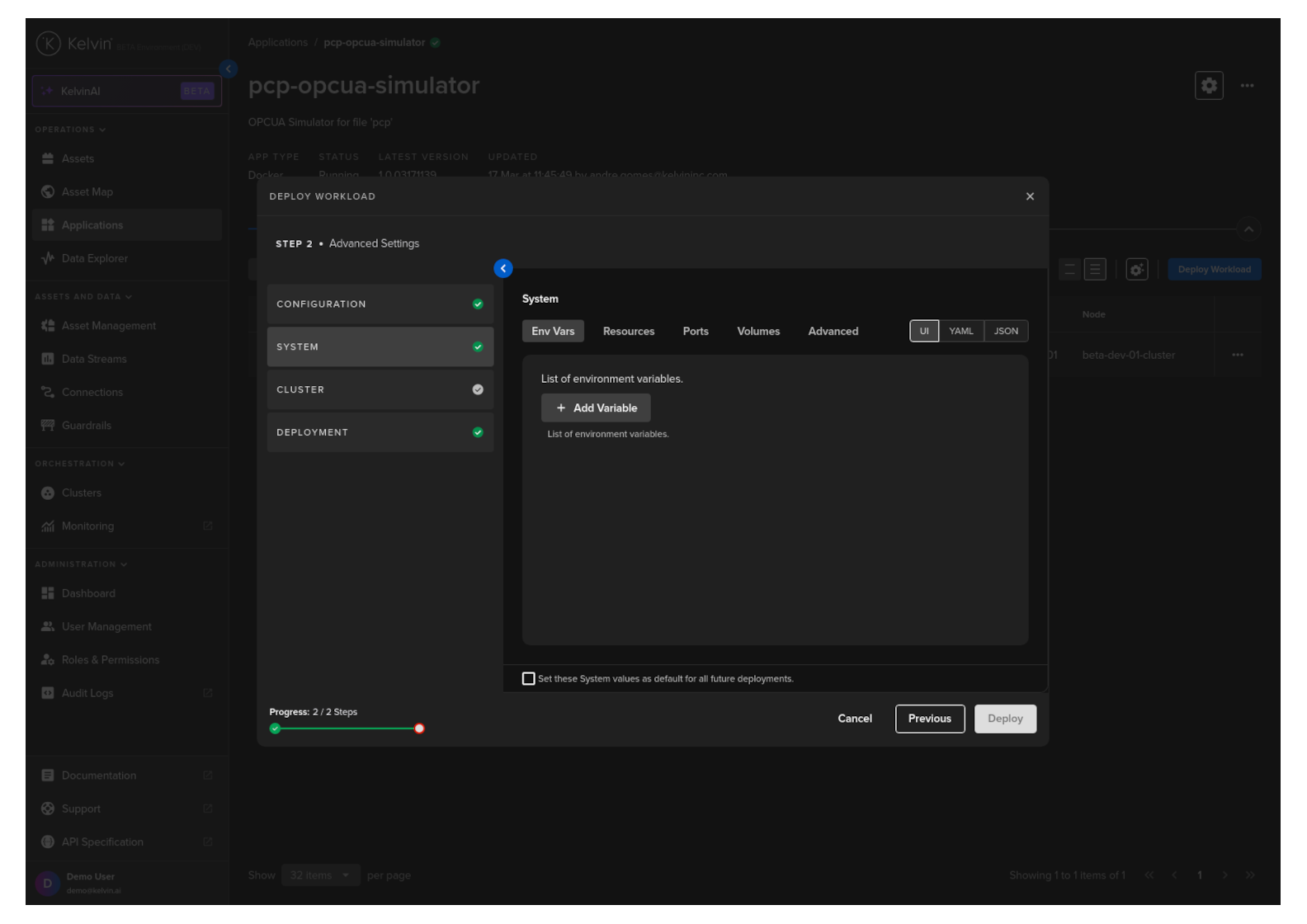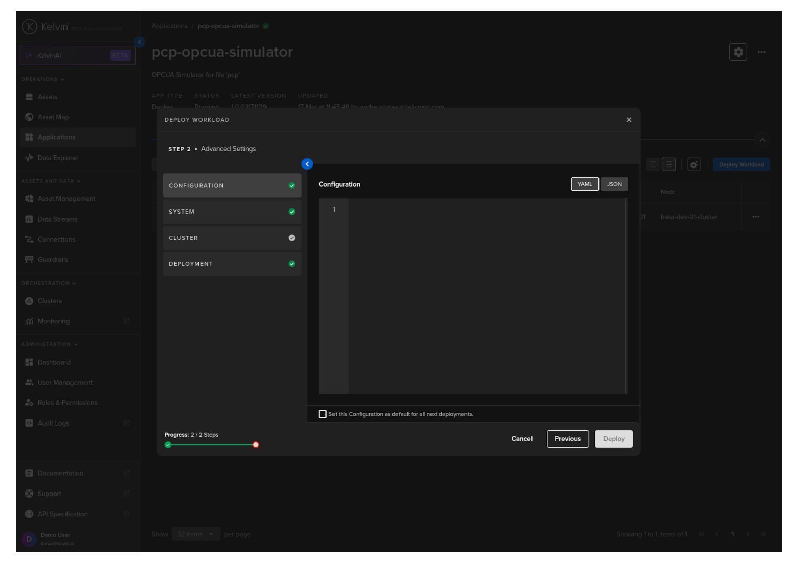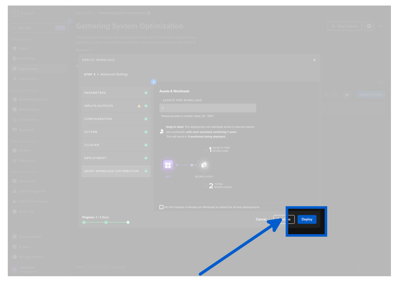 To start, go to Applications, select a Kelvin SmartApp™ with an App icon , click on the Workloads tab then click on the Deploy Workload button;