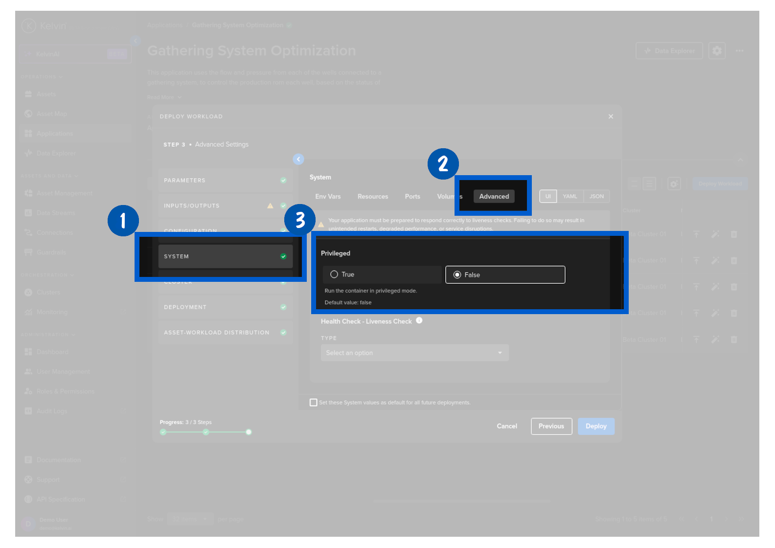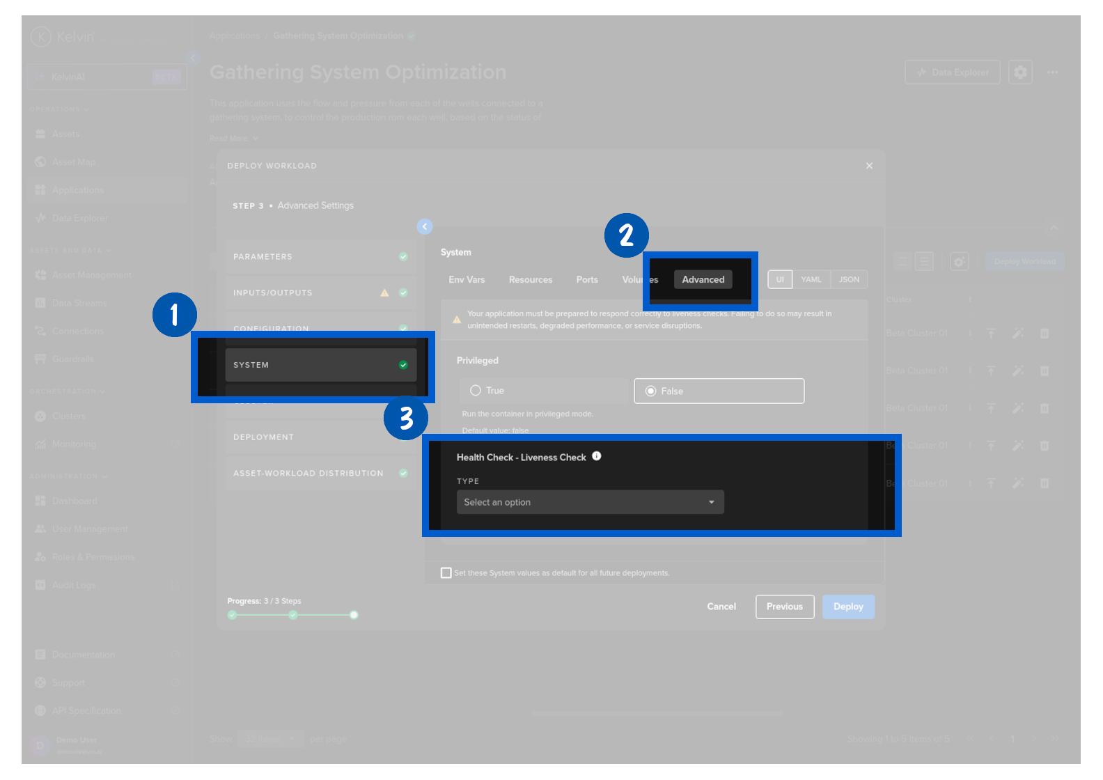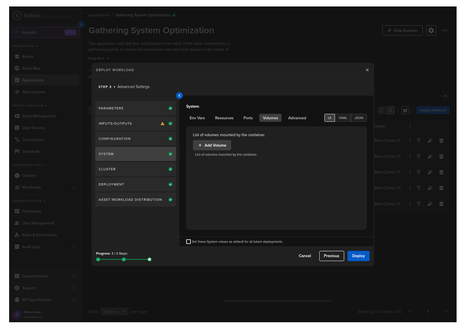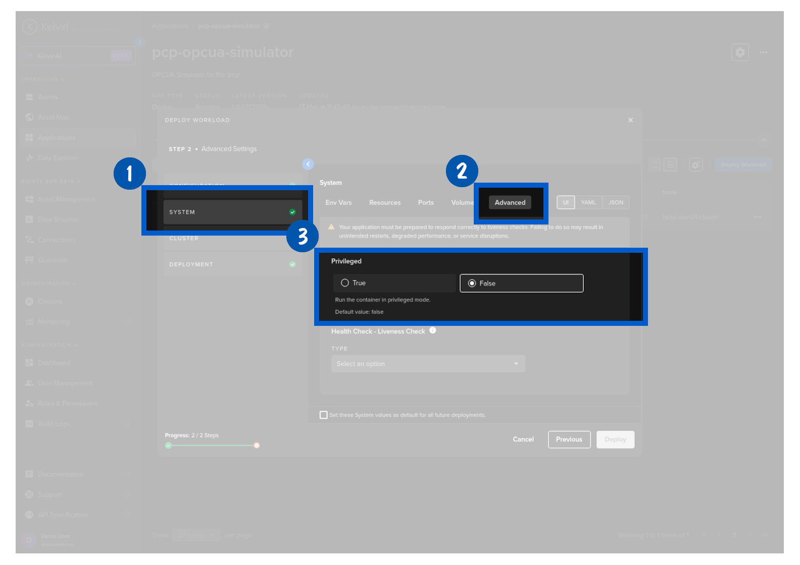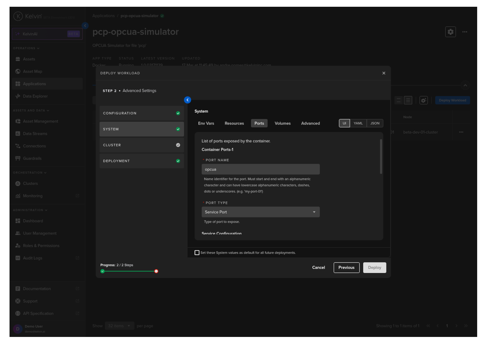 To start, go to Applications, select a Kelvin SmartApp™ with an App icon , click on the Workloads tab then click on the Deploy Workload button;