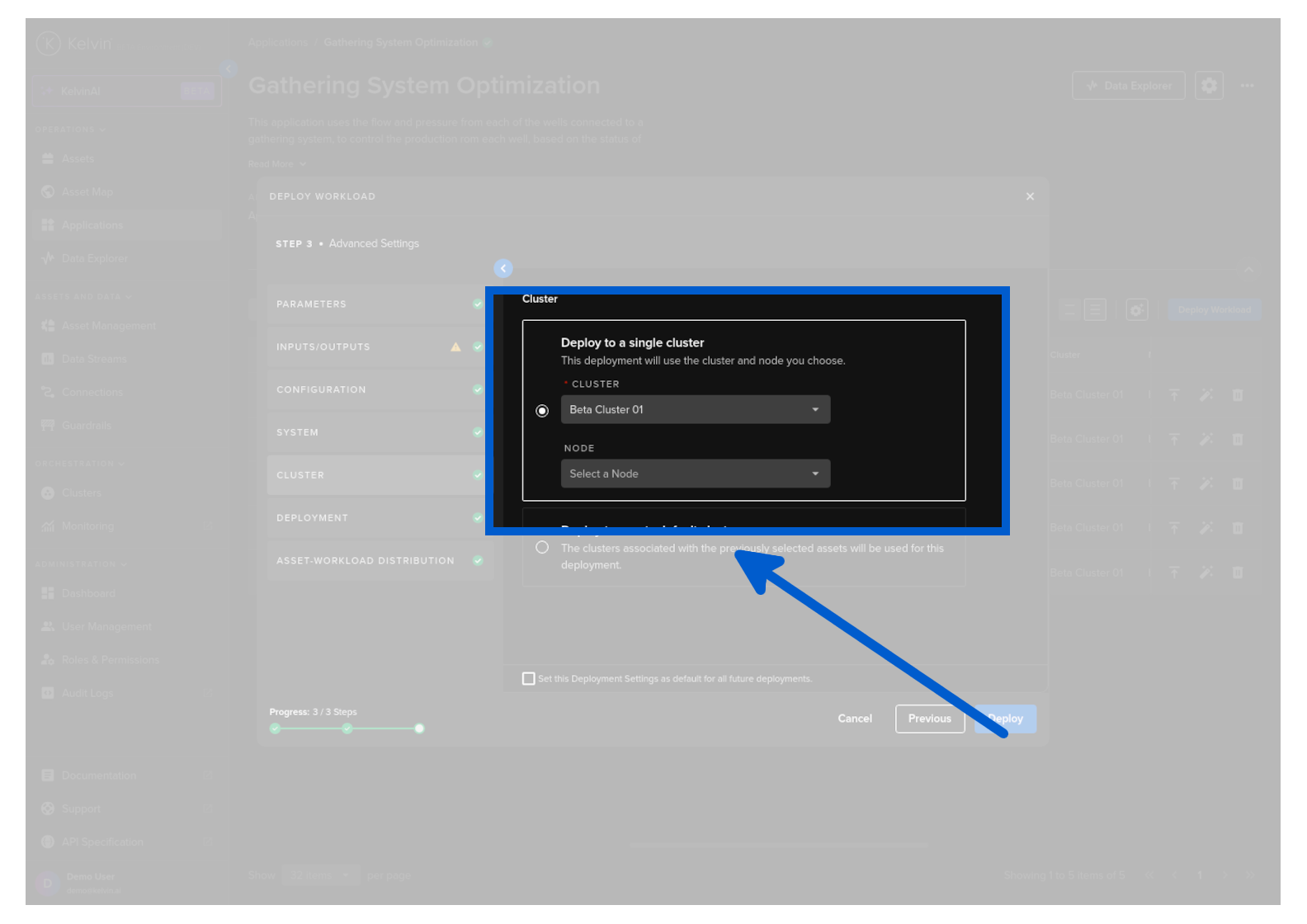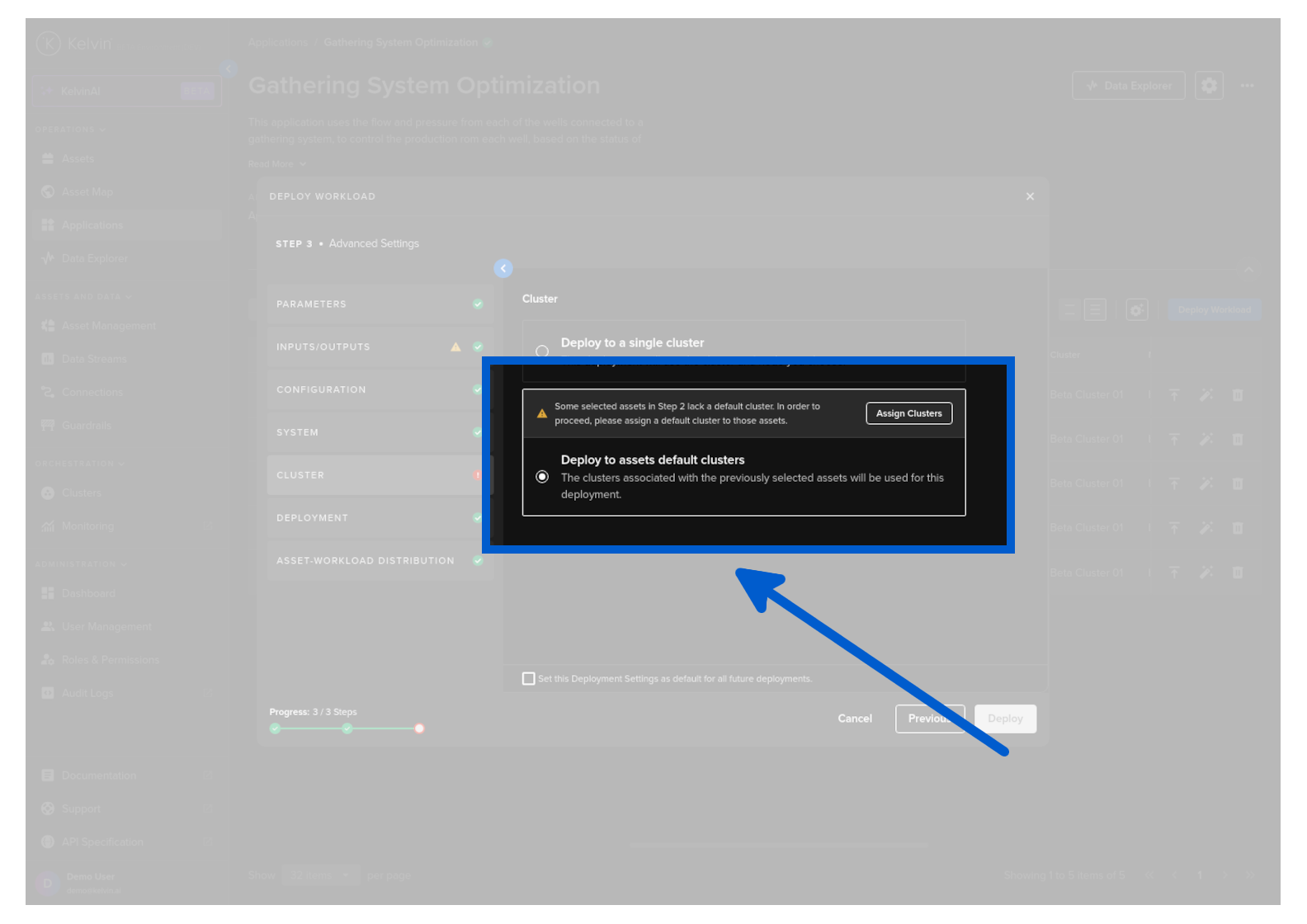 Choose which Cluster the Assets will be deployed to. There are two choices