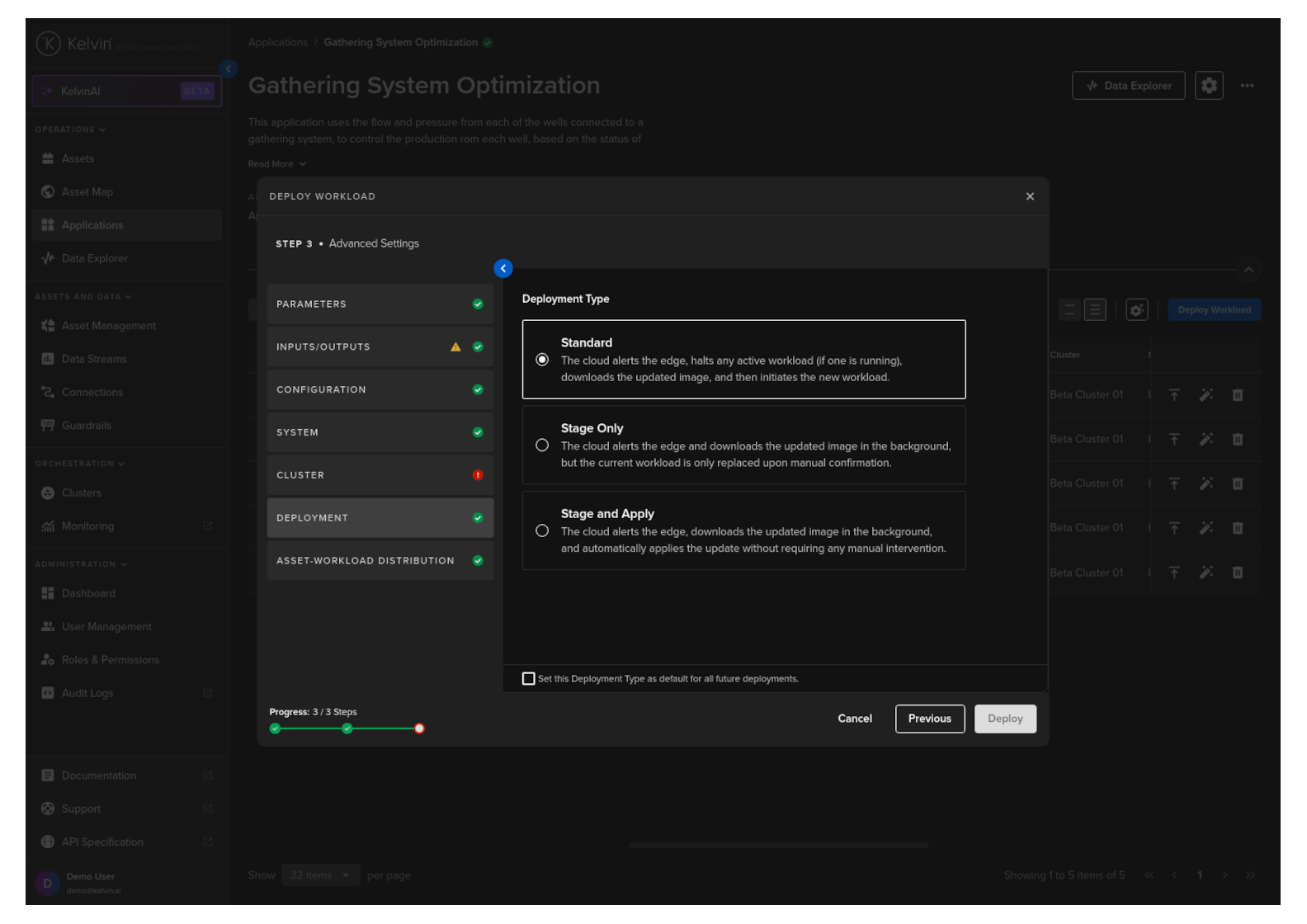 | Staged | Instant Apply | This will use Kelvin's deployment process for workload containers and the workload will be automatically started after downloaded to the edge. The difference to the Kubernetes deployment process is that Kelvin will download all workloads and stage them first. Only when all workloads have been successfully downloaded will the start command be given to all the workloads. |