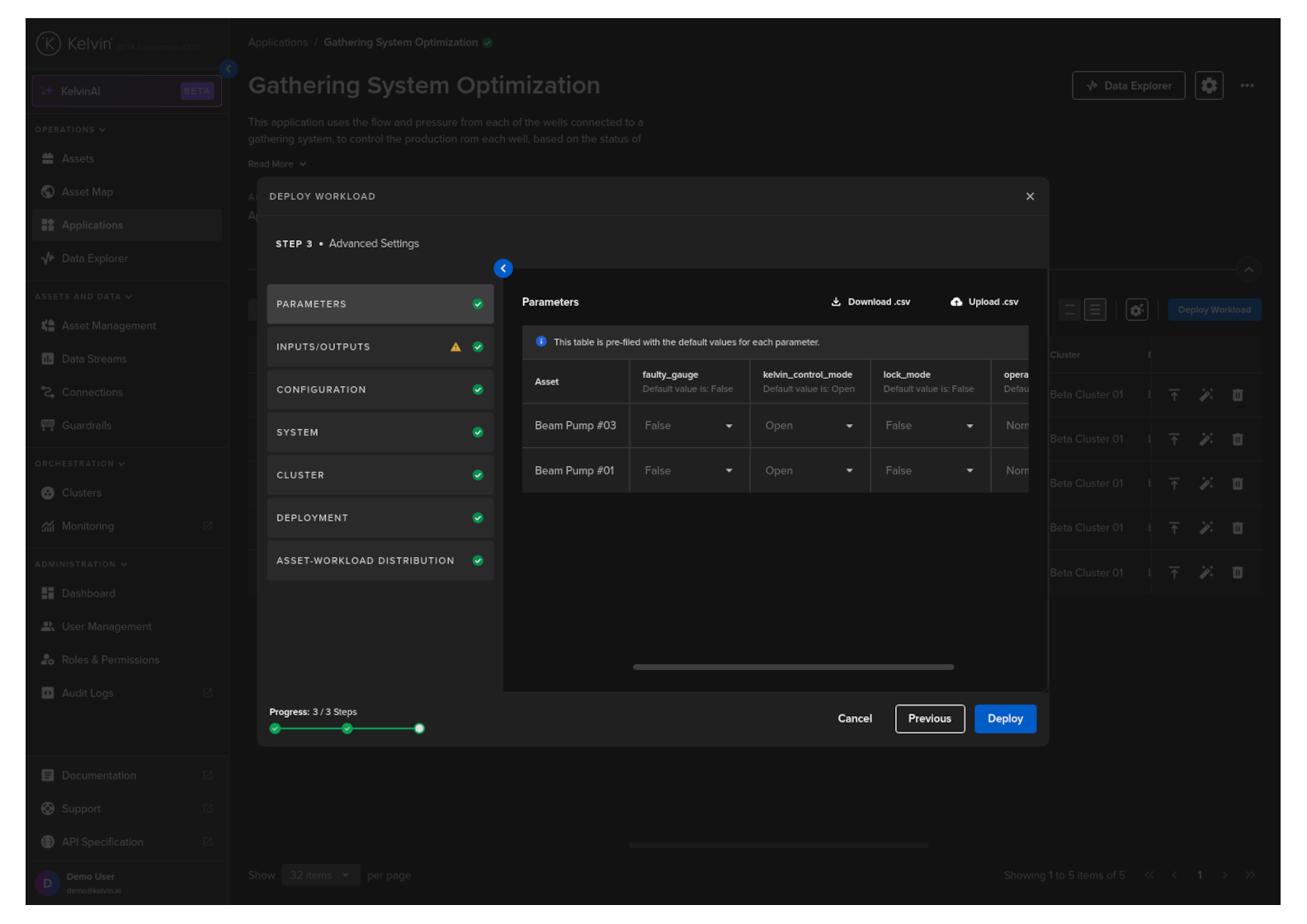 Select the Parameter values that each Asset should start using for this Kelvin SmartApp™ when deployed.