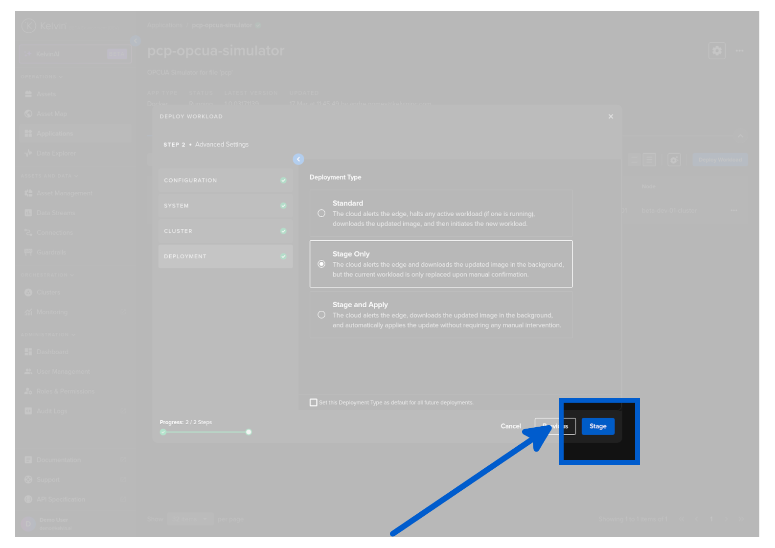 | Staged | Stage Only | This will download the workload to the edge but will not start the workload. You will need to send an additional command to start the workload either through the Kelvin API or locally in the terminal of the edge computer |