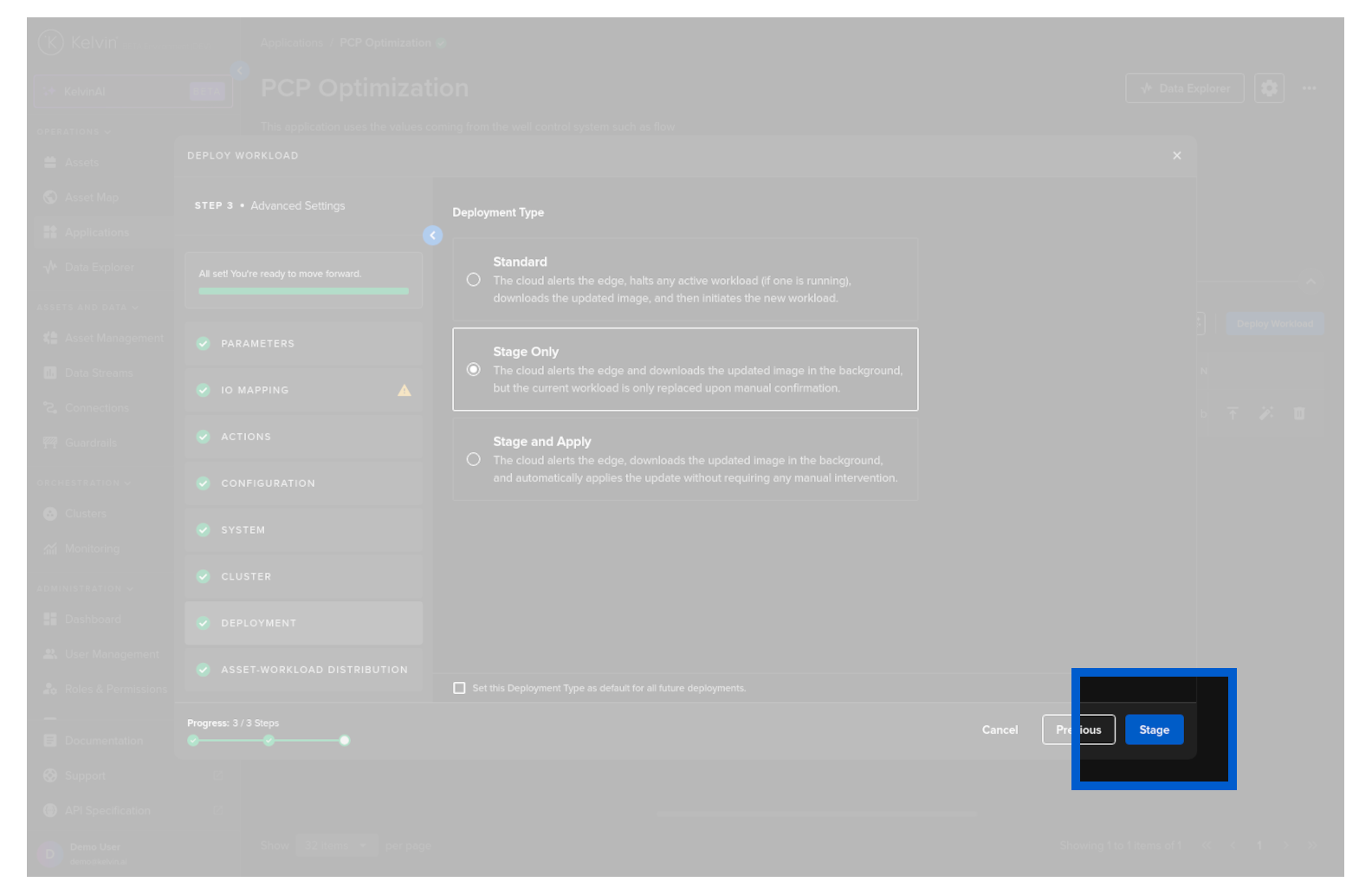When you deploy a workload, you can choose whether to deploy immediately or to stage the workload at the edge and apply it at a later time.