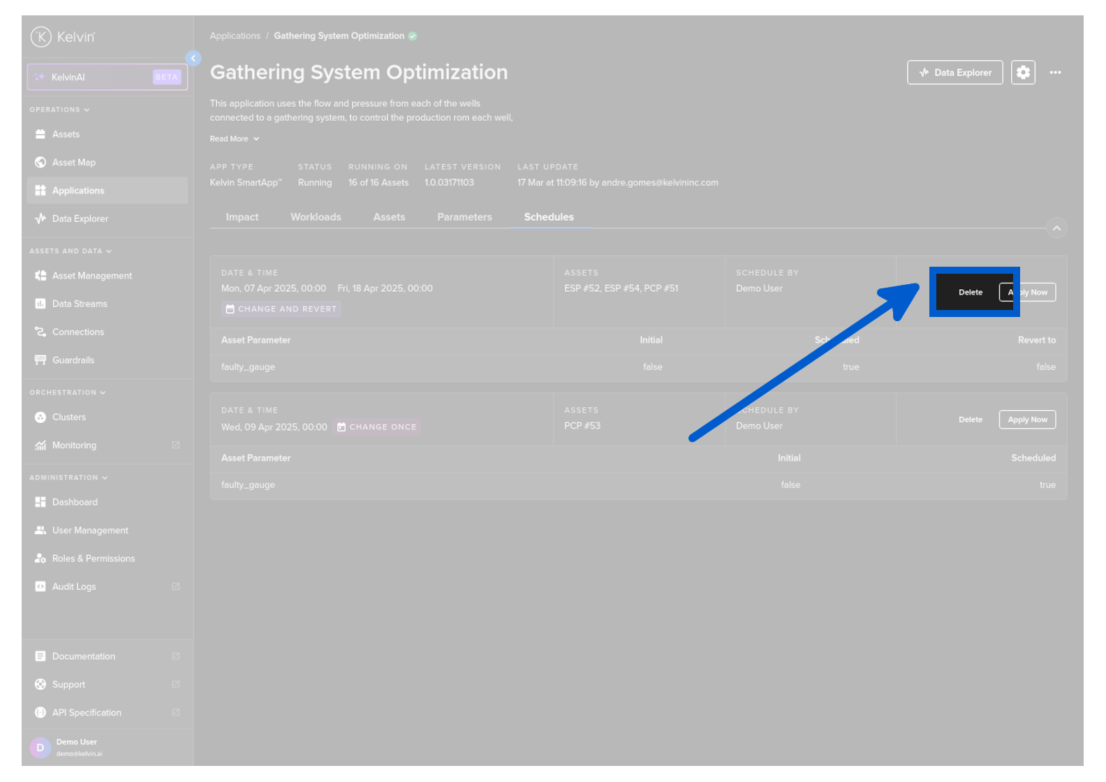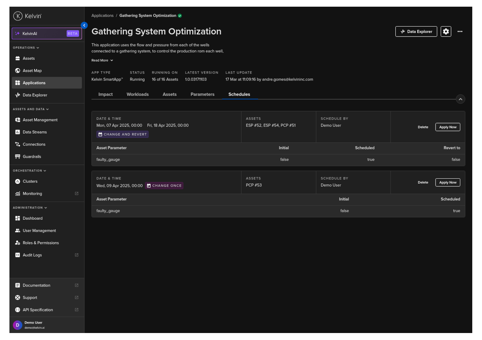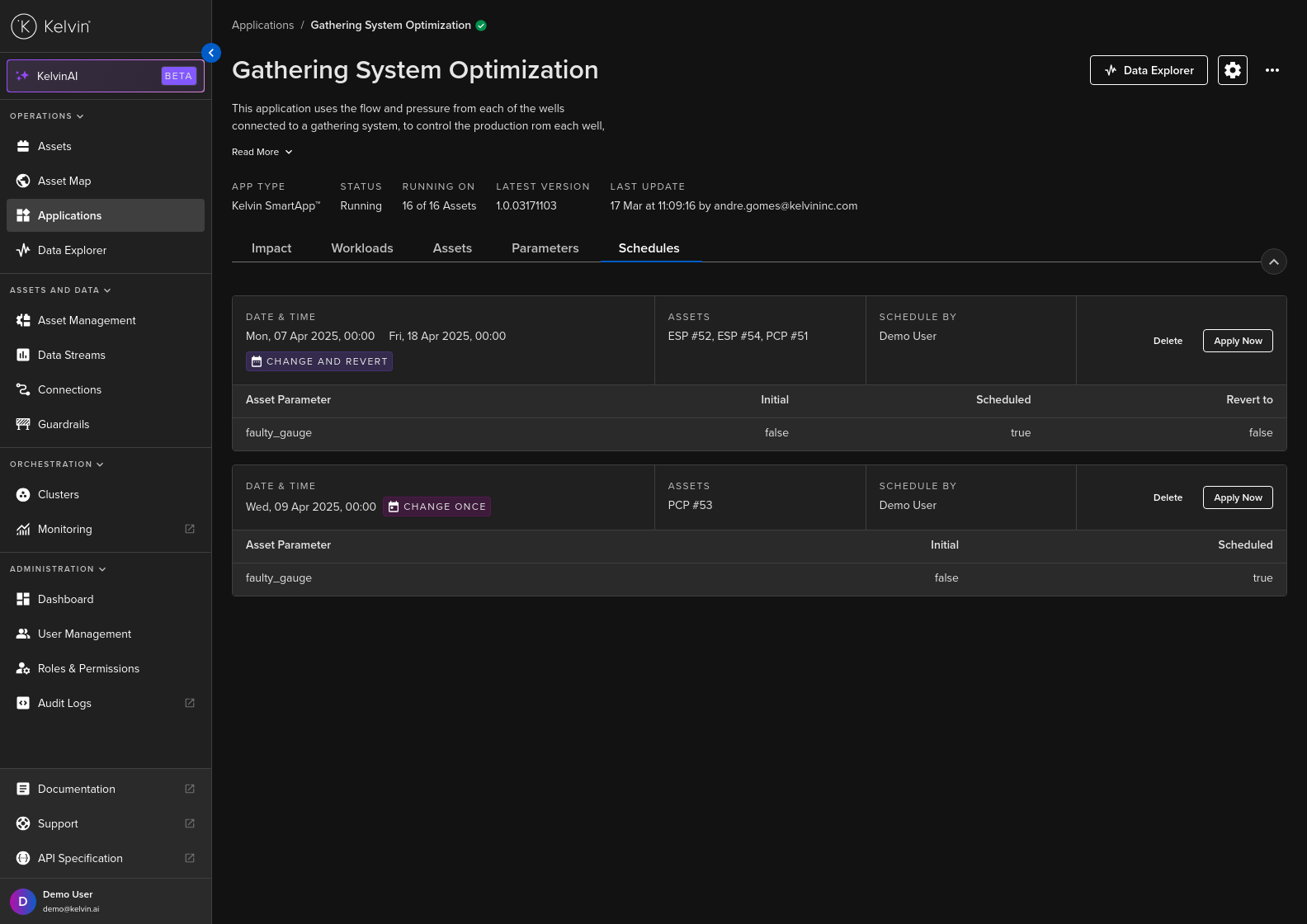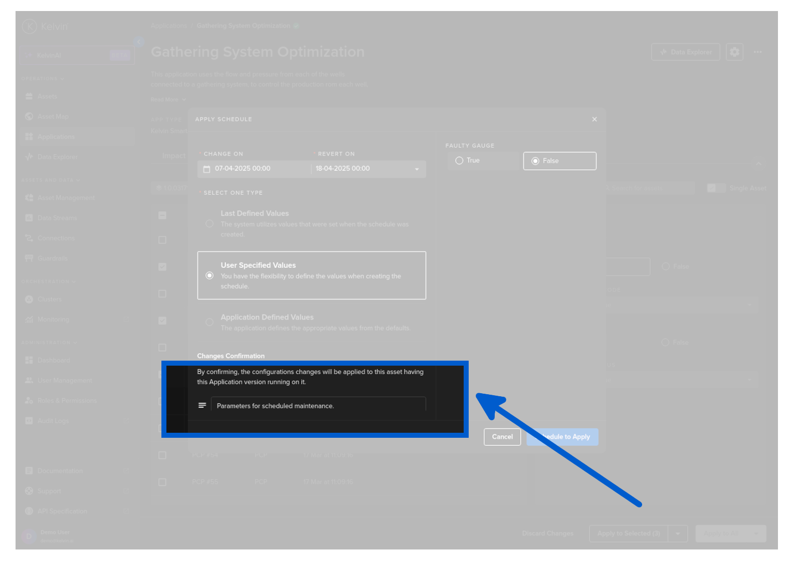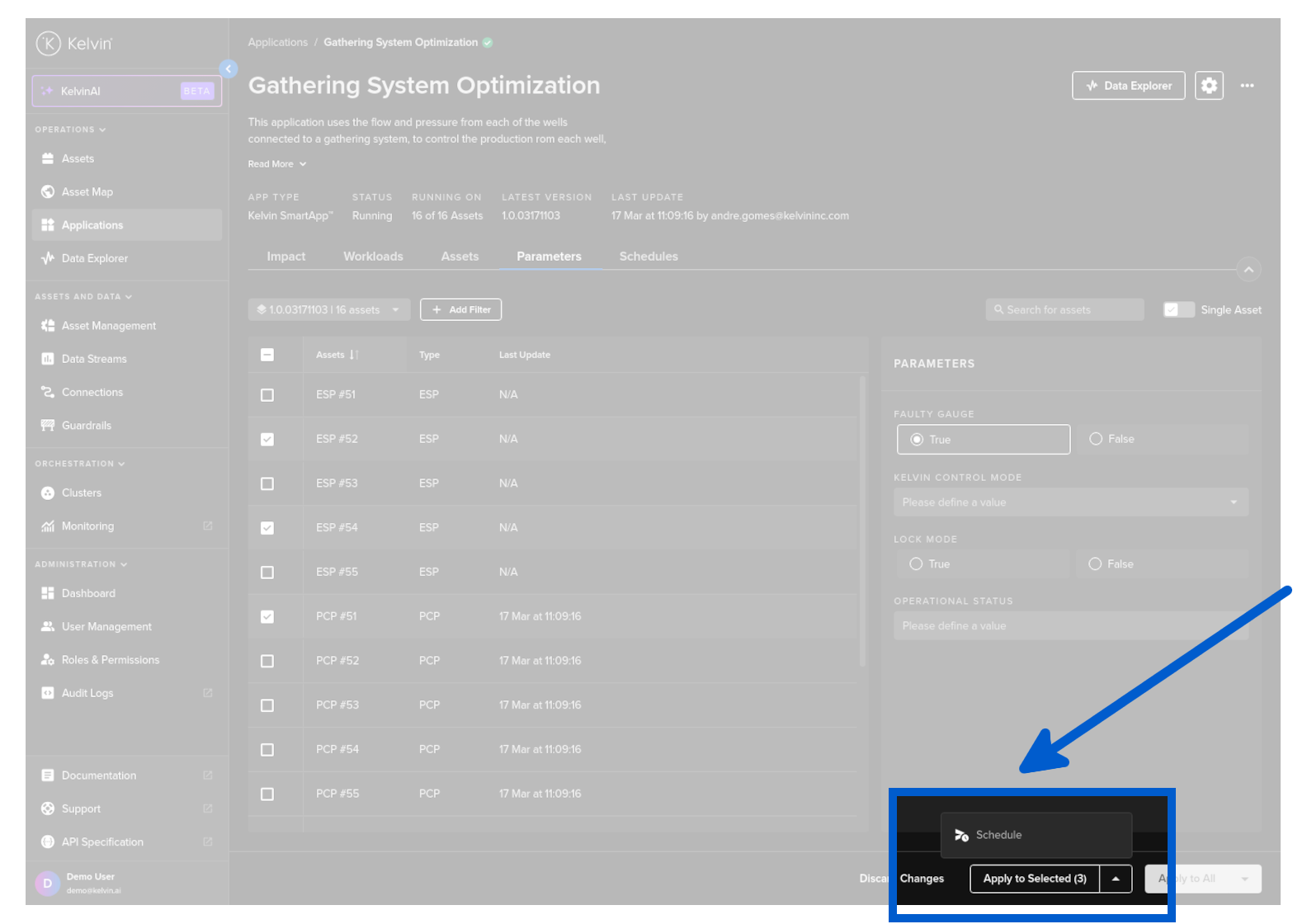 To start you can create a new schedule that will apply updated Kelvin SmartApps™ parameter values to selected asset at a defined time.